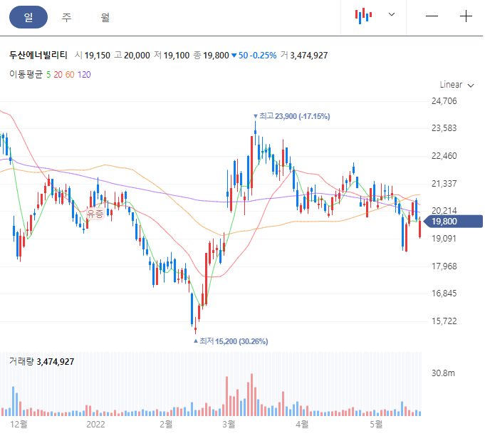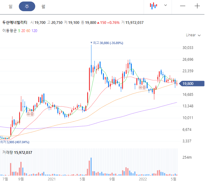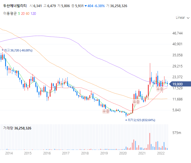 두산에너빌리티는 주봉상 2번의 유증을 했음에도 꾸준히 주가가 상승하는 그래프를 보이고 있다. 120주 평균이 꾸준히 올라오는 것이 매우 놀랍다. 20년 9월쯤 투자를 시작한 투자자는 2번의 유증에도 불구하고 수익도 얻고 주식 수도 꾸준히 늘렸을 것이다. 16만원 가까웠던 주식이 5천원까지 떨어진 것을 경험한 투자자라면, 지금 허탈하겠으나, 투자에서 매수는 기술 매도는 예술인 것을 어찌하겠는가!