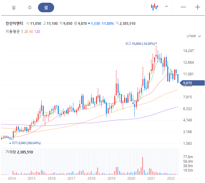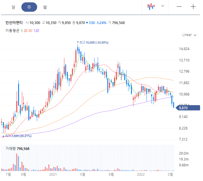 월봉상 인선이엔티는 다소 긍정적인 상황이다. 60개월 이평선 위에 있으면서 월봉상 기간 조정에 들어간 것으로 파악된다. 심각한 부도 상황이 아니면 20개월 이평선 위로 연내 상승할 것으로 보인다. 단기적으로 11,000원 까지는 상승할 여력이 있어 보인다. 최대 7,800원까지 떨어질 수 있을 것으로 보이며 11,000원을 뚫을 때가 본격적인 상승 모멘텀이 생기는 시점일 수 있을 것으로 보인다.