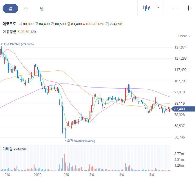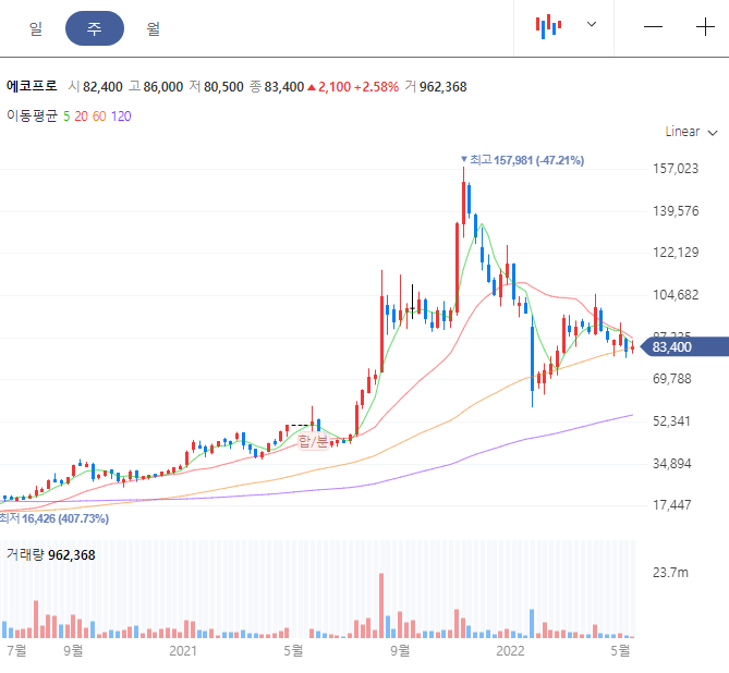 에코프로 주봉을 보면 5주봉/20주봉/60주봉이 만나는 상황이 연출되고 있다. 모멘텀만 발생한다면, 반등을 노릴 수 있을 것으로 보인다. 모멘텀이 필요한 상황이다. 만약 모멘텀이 없다면 속절없이 주저앉을 수 있다.