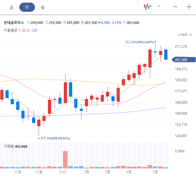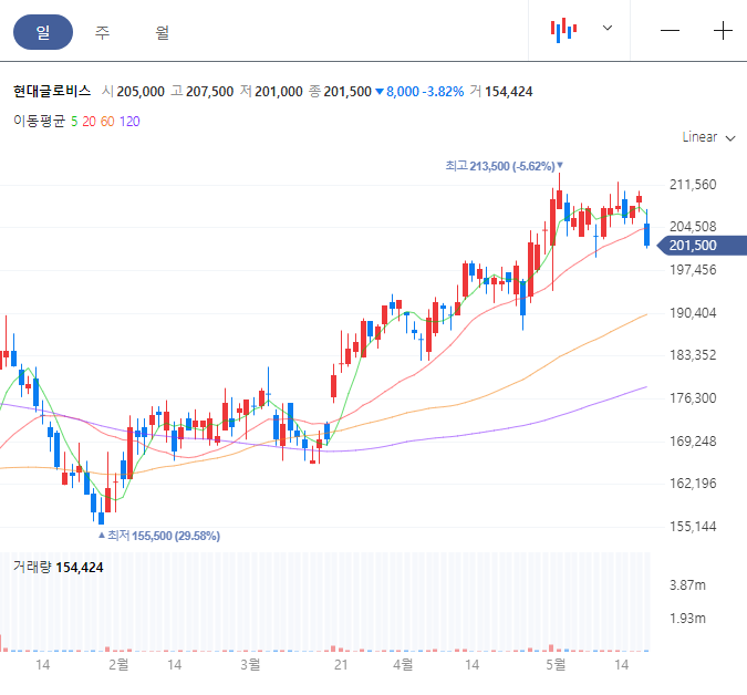 현대글로비스 주봉도 꾸준한 상승을 보이다가 5월 들어 기간 조정에 들어가는 것처럼 보인다. 저점 매수 타이밍을 20만원 언더에서 찾으려 애쓰고 있는 것 같기도 하다.
