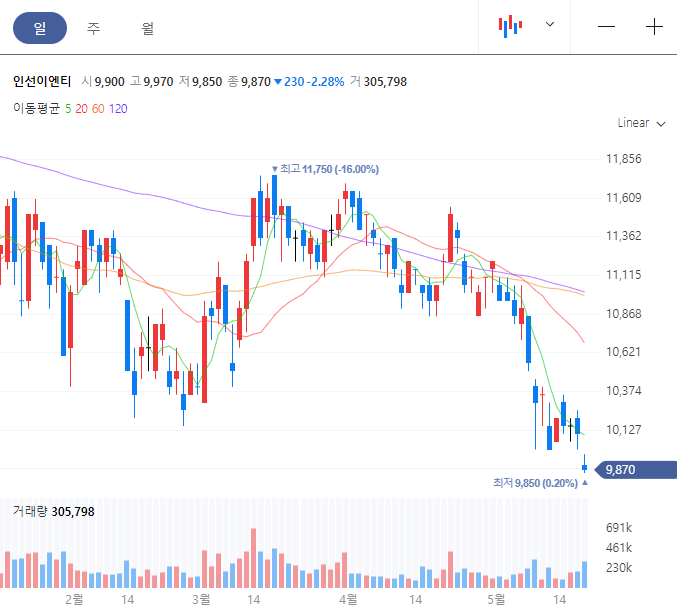 일봉상 인선이엔티는 모든 이평선을 깨고 내려와 있다. 현실적인 모멘텀이 없다면, 상당기간 1만원을 넘기기 어려울 것으로 보인다. 배터리 재활용 사업 관련 계약이 성사되지 않는다면, 이 지점에서 벗어나기 어려울 수 있다.