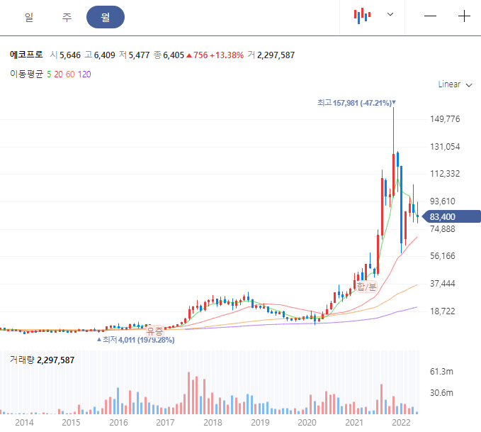 에코프로의 월봉은 좀 암울하다. 아직 가격조정만 있었고, 기간 조정이 진행되지 않았다. 특별한 모멘텀이 없는 한 급반등은 어려울 것처럼 보인다.