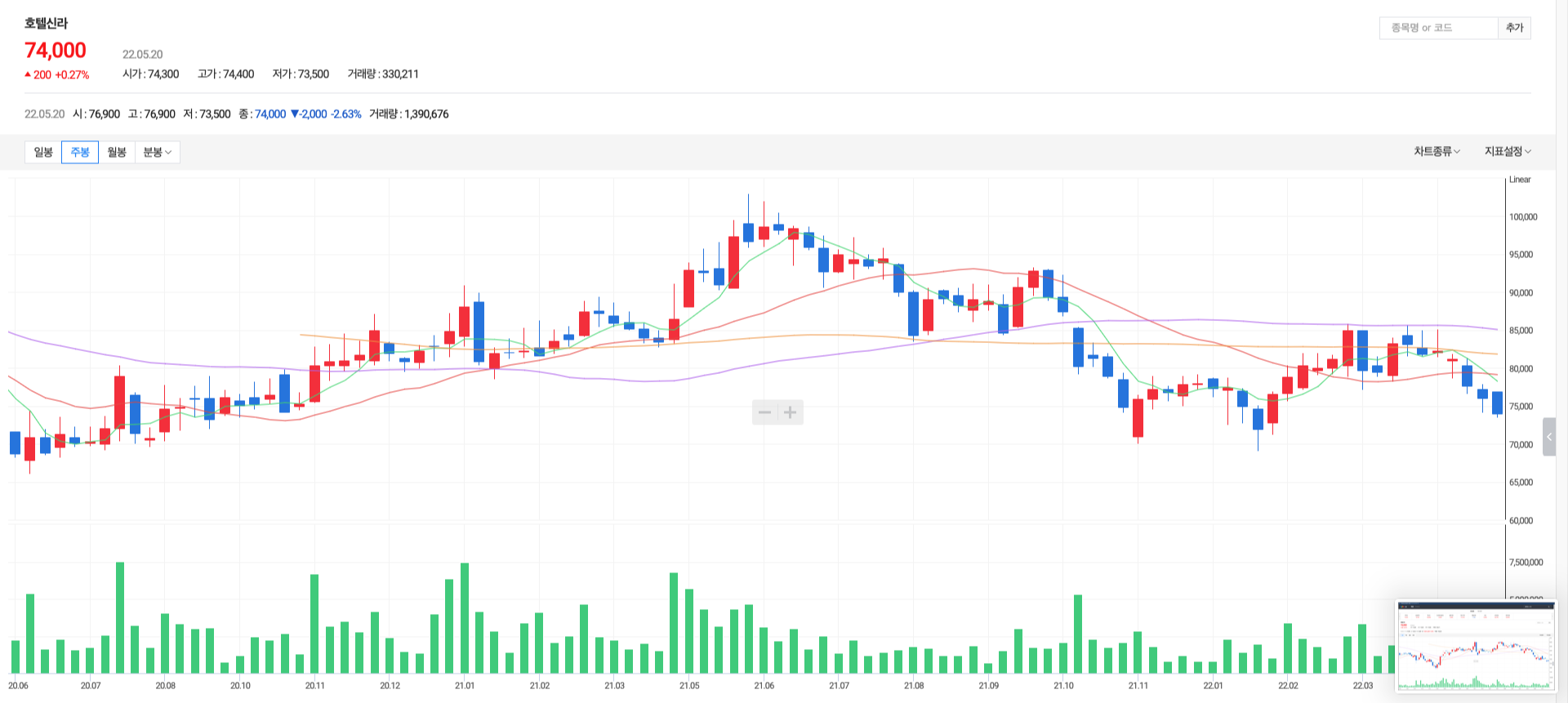 호텔신라 주봉의 모습도 단기간에는 회복하기 어려운 모양이다.