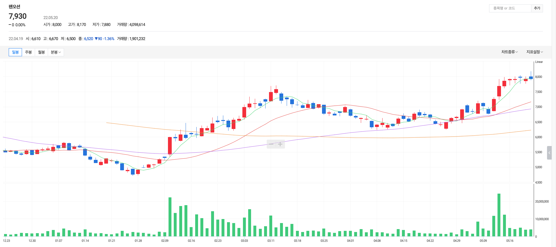팬오션의 월봉은 긴 시간동안 하락을 겪었기 때문에 의미 있는 부분은 지난 1년 정도의 차트 정도이다. 작년 12월을 기점으로 주가가 추세 상승하고 있다. 그러나 물동량에 따라 수익이 결정되는 구조의 기업이기 때문에 장기 투자에는 적합하지 않아 보인다.