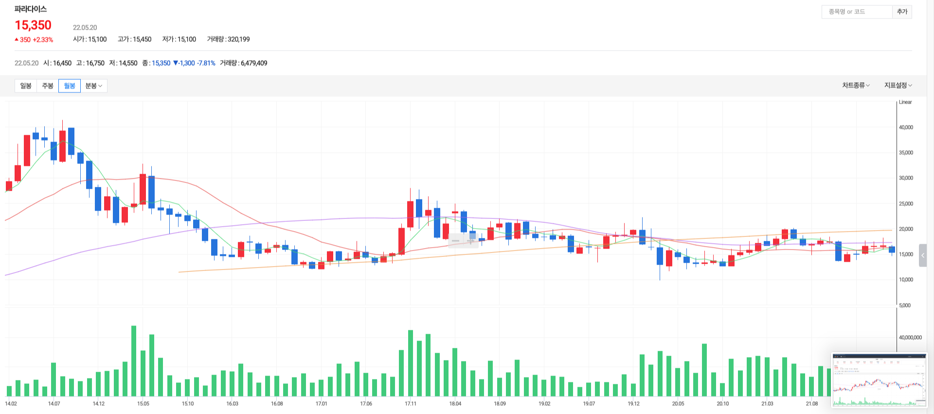 파라다이스의 월봉을 보면 과거 화려했던 시절을 뒤로하고 계속 횡보하는 형태를 보이고 있다. 중국인과 일본인 관광객에 의존하는 사업구조를 여실히 보여주고 있다. 획기적인 신규 아이템이 없을 경우 지속적으로 횡보할 것으로 보인다. 파라다이스 측에서 롯데관광개발 측으로 제주 카지노를 넘긴 것으로 알려져 있는데, 카지노 수익이 파라다이스 영업이익에 크게 기여하지 않았던 것으로 보인다. 단기 상승은 기대할 수 있으나, 장기적으로는 투자 매력도가 떨어져 보인다.