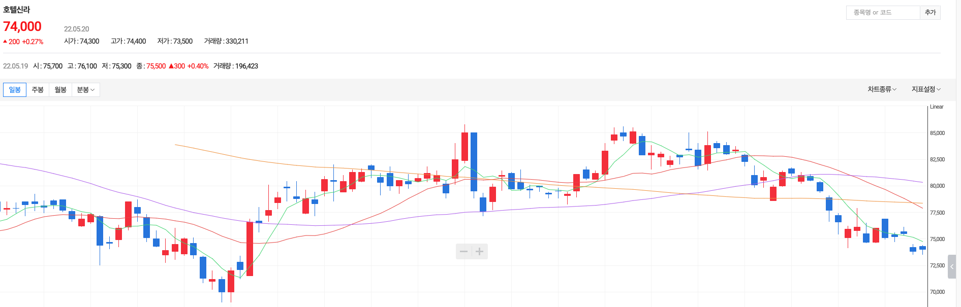 호텔신라 일봉을 보면 완전히 부러진듯한 모양을 하고 있다. 단기간 회복은 어려울 것으로 보인다.