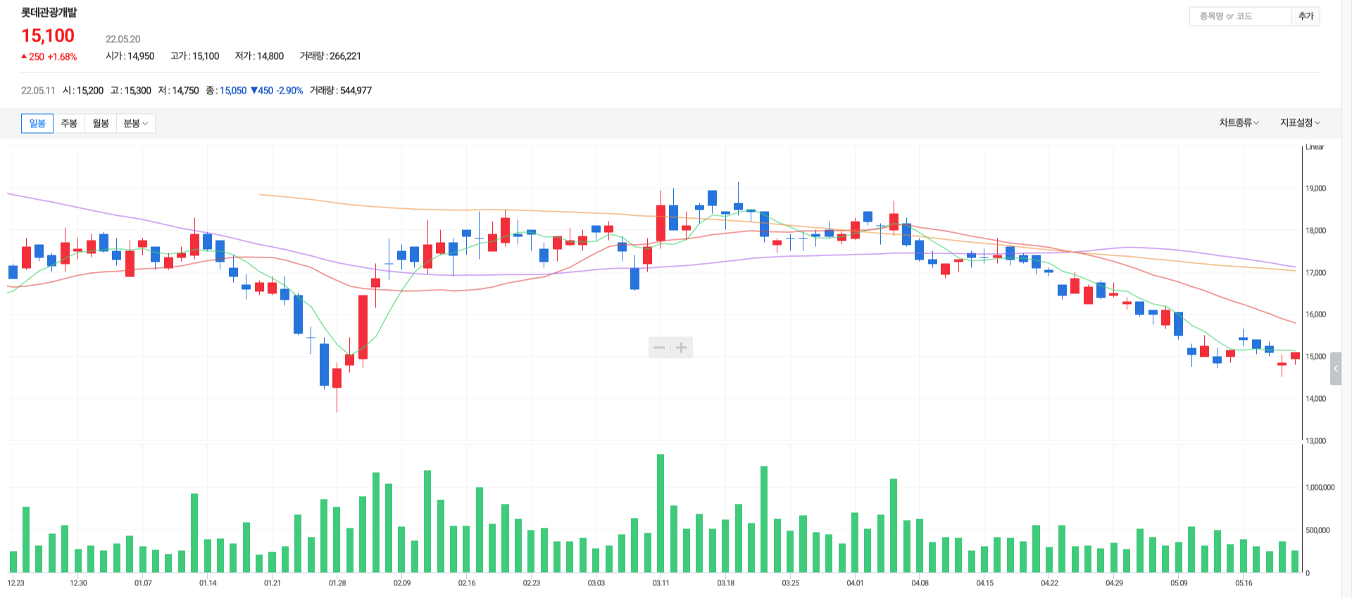 롯데관광개발의 일봉을 보면 심하게 부러진 차트를 보여준다.
