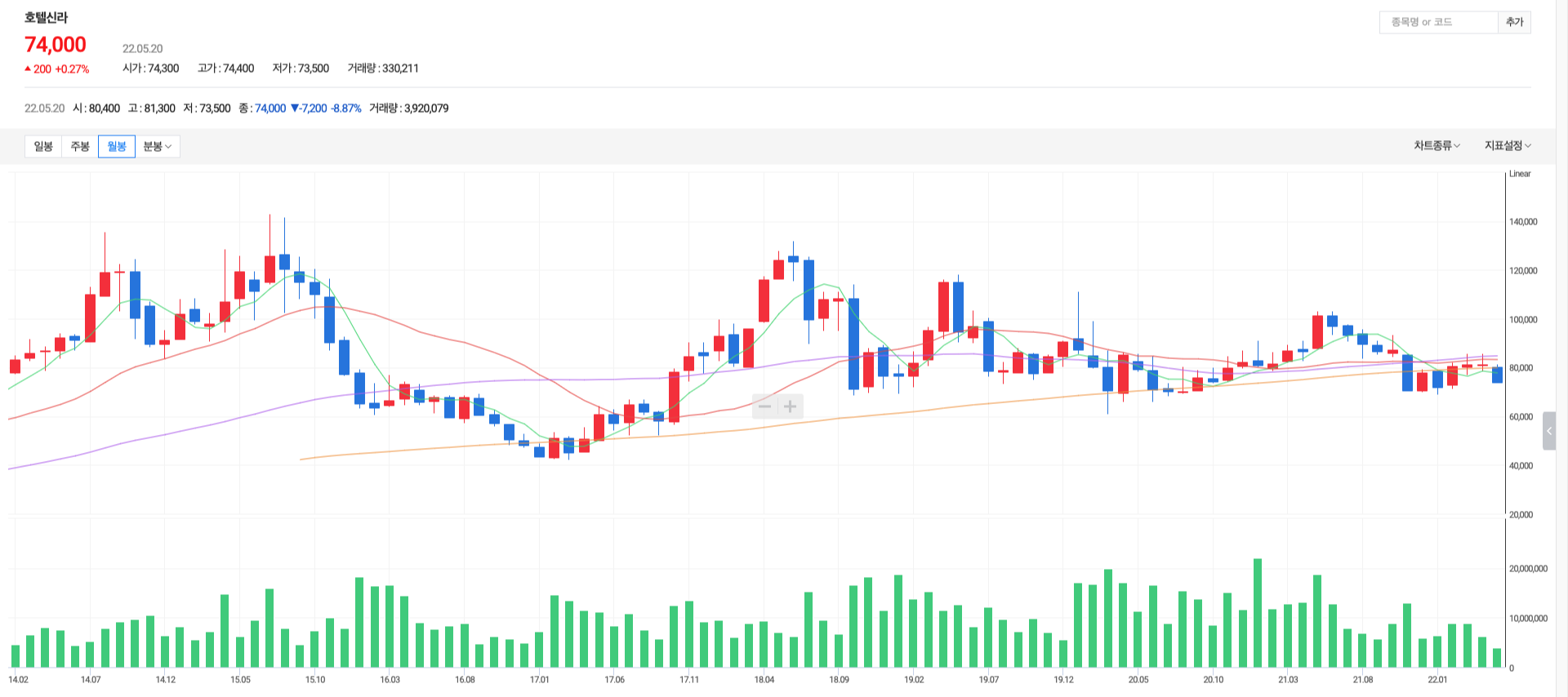 호텔신라 월봉을 보면 2월부터 반등 시도가 있었음을 확인할 수 있다. 5월 들어 하락폭이 크지만, 1월 대비 저점을 확인하는 수준으로 보이며, 거래량이 실리지 않았기 때문에 6월 반등이 가능할 것으로 보인다. 증권사 리포트들이 지금 나오는 것을 보면 저점이 확인됐다고 애널리스트들도 판단하는 것 같다.