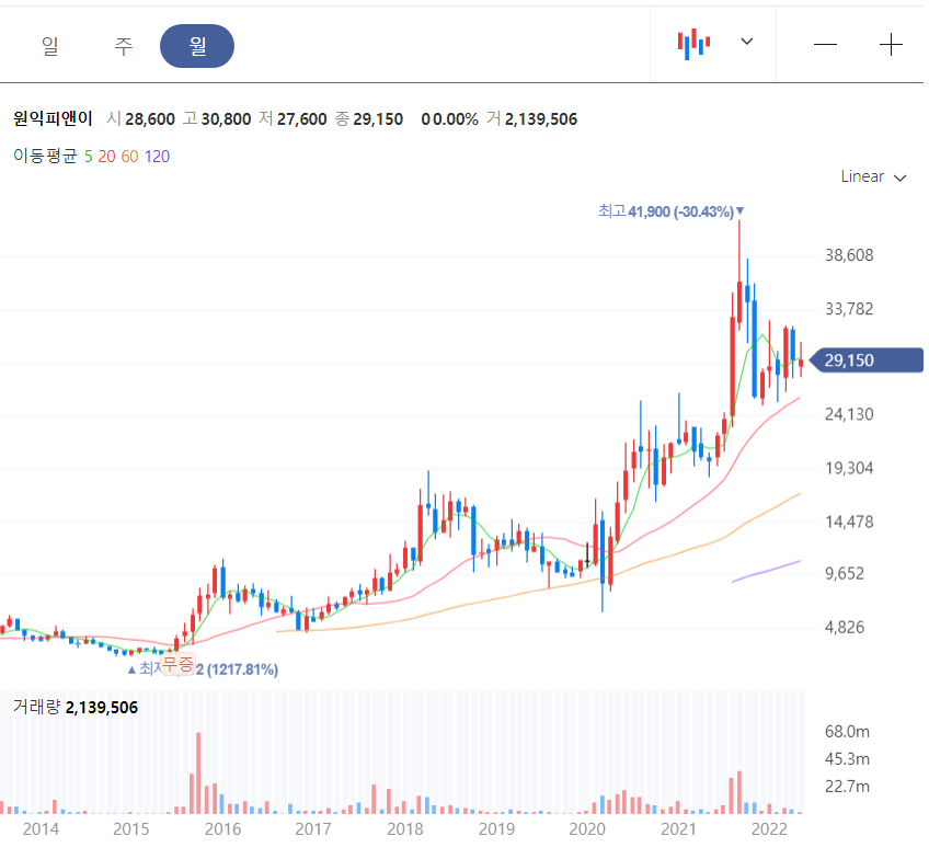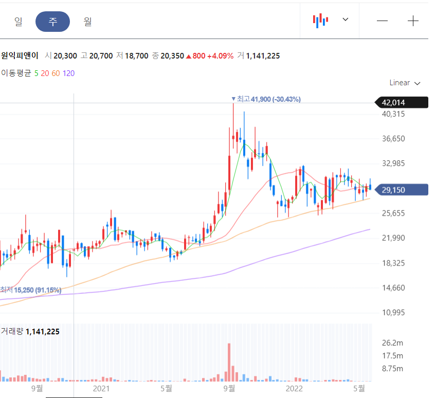 원익피앤이는 역사적 신고가를 작년 9월에 작성한 이후 다소 기간 조정을 보이는 것처럼 보인다. 그러나 우상향 하는 추세가 꺾이지 않았다. 장기적인 관점에서 후공정 장비 수주가 늘어날 것으로 예상하는 투자자가 많은 것으로 보이며 60주 평균선을 깨뜨리지 않고 성장하고 있다.