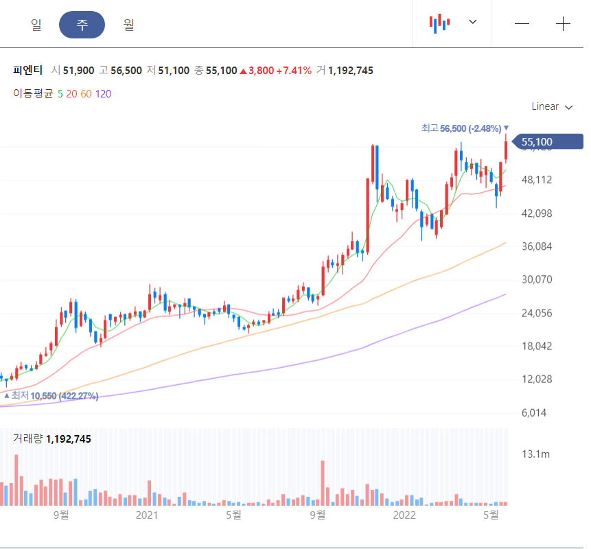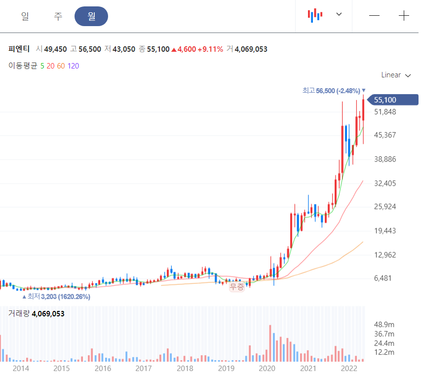 피엔티는 2차전지2차 전지 장비주의 대장 역할을 하고 있다. 2차 전지 공정 중 가장 까다로운 롤투롤 공정용 장비를 생산하는 업체로 원통형 배터리가 대세인 요즘 증설 이야기가 나오면 바로 상승할 수밖에 없는 주식이다. 본격적인 수주 잔고가 증가하는 시점이어서 피엔티 주식은 역대 최고가를 경신하고 있다.