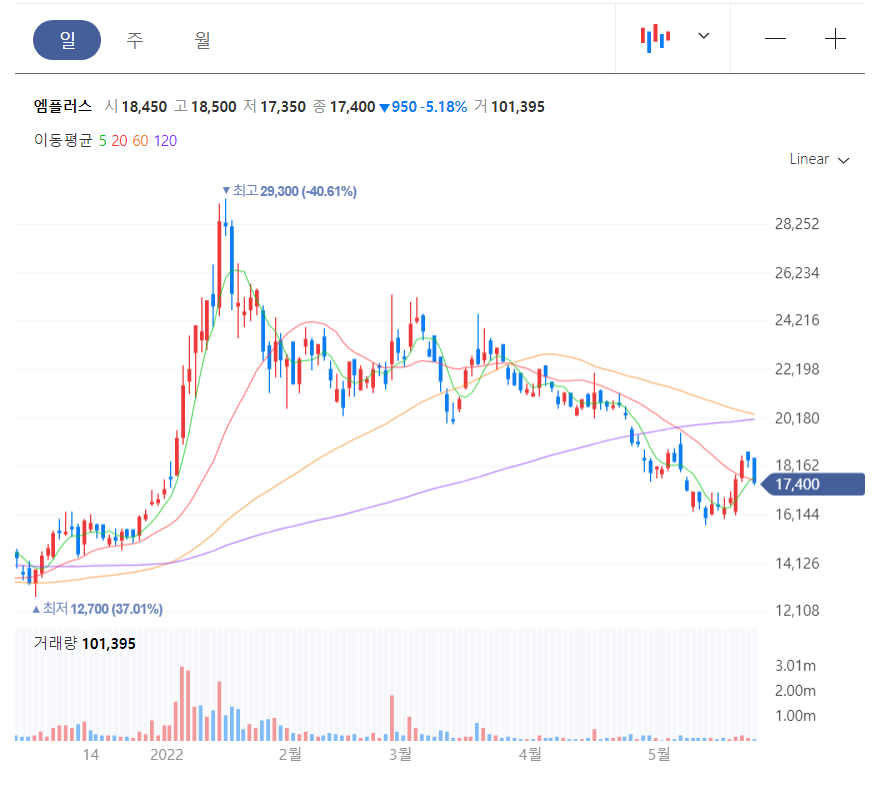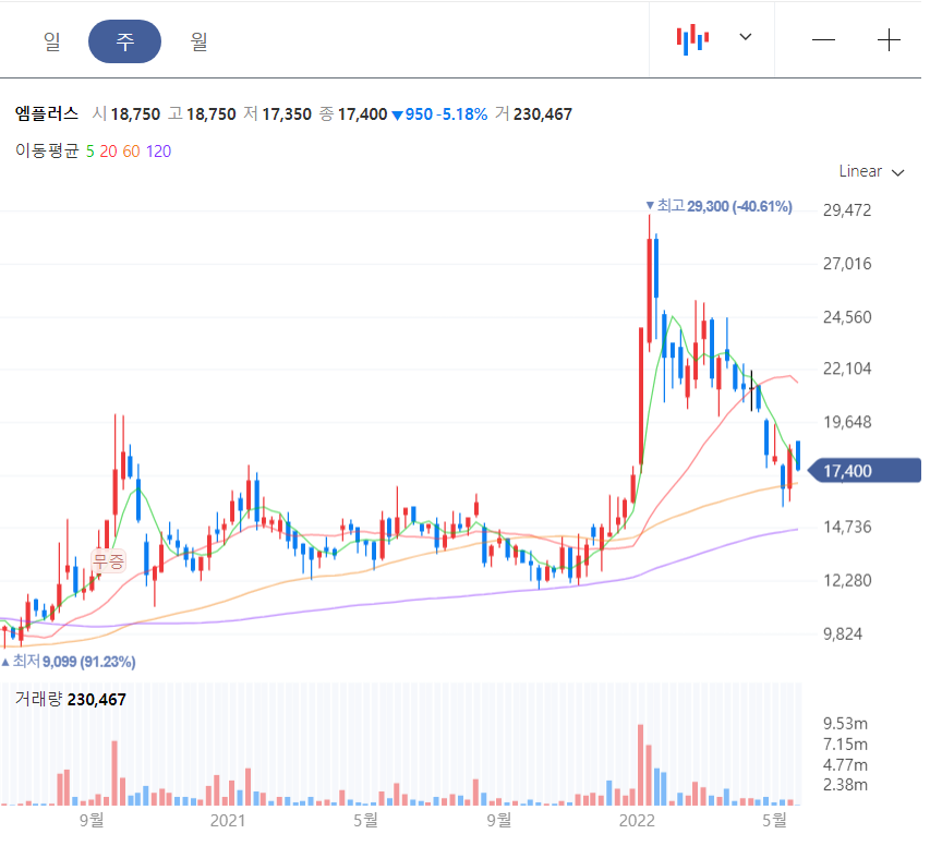 엠플러스는 월봉상 완전히 주저 앉았다고 보기는 어렵다. 그러나 반등을 아직 만들어내지 못했다.