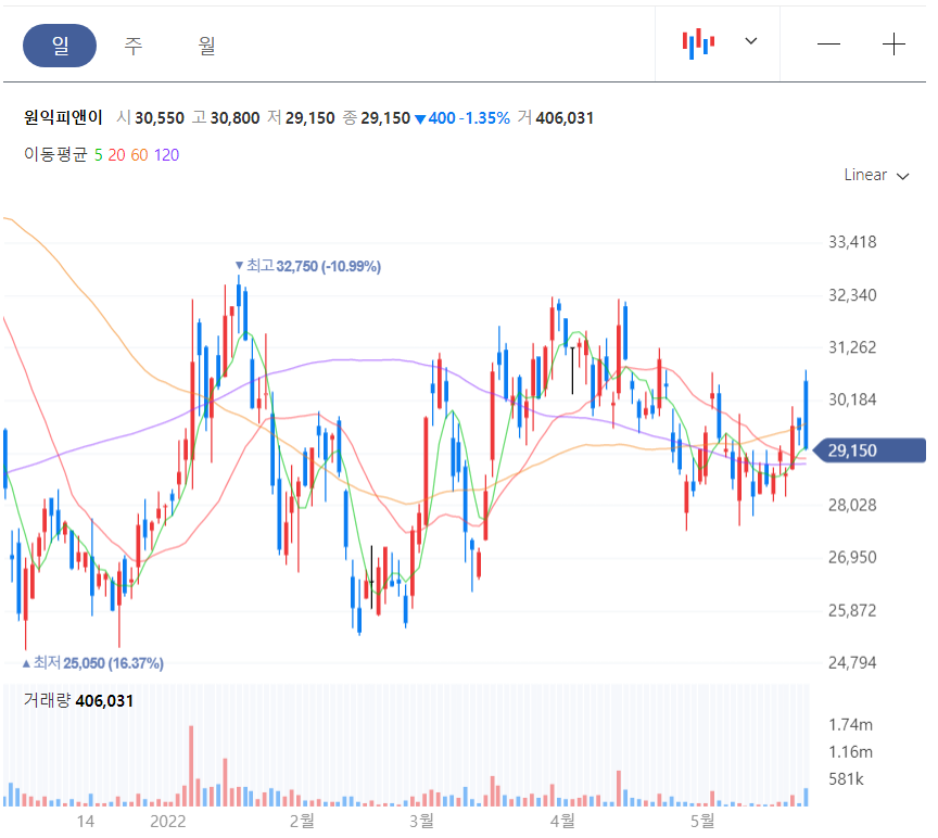 일봉이 매우 혼란스럽다. 차트만 보는 사람들의 이야기로는 에너지를 모으는 것처럼 보인다. 그러나 원익피앤이가 가진 기술력으로 배터리 3사와 파트너십이 완전하게 형성되었다는 공시가 없었기 때문에 장담하기 어렵다.