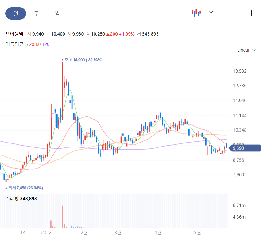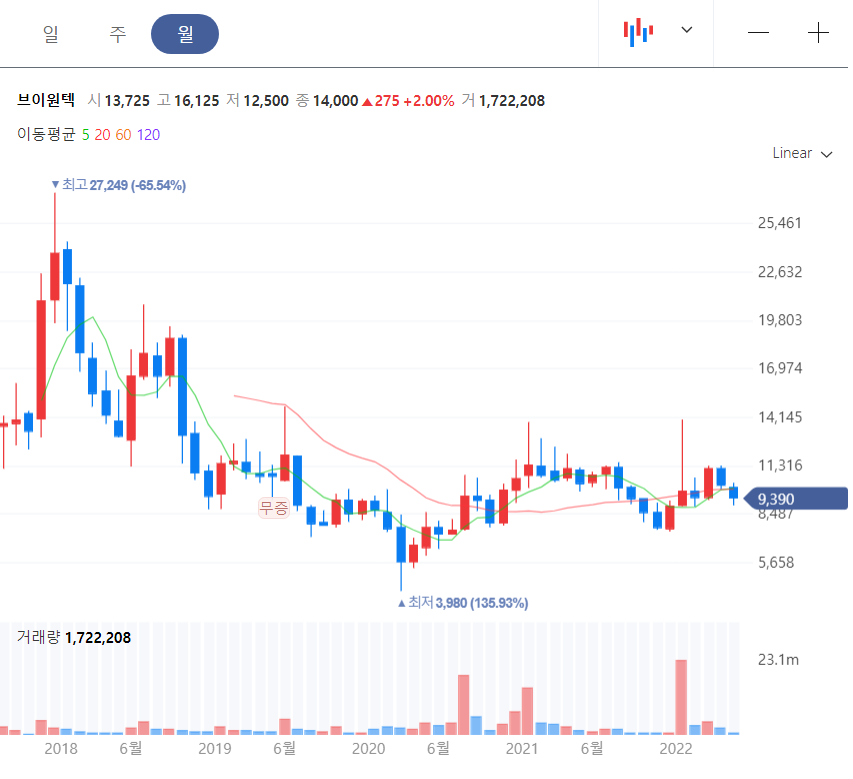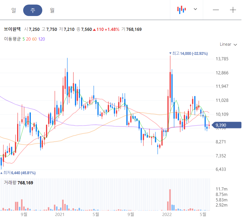 브이원텍 주봉을 봐도 박스권이다. 다만 120주 이평선을 기반으로 다시 올라갈 수 있다는 기대감이 조금 있어 보인다.