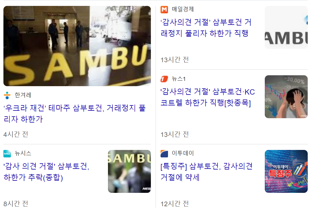 삼부토건은 최근 회계감사인인 삼일회계법인으로부터 2024년 상반기 연결 재무제표에 대해 의견 거절을 받았습니다. 이는 회사의 재무 상태에 대한 심각한 우려를 나타내는 것으로, 투자자들의 신뢰에 큰 타격을 주었습니다.