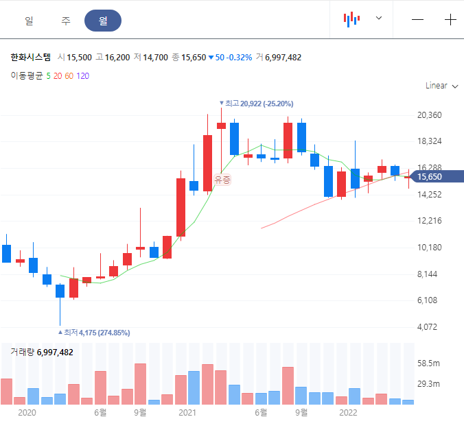 한화시스템은 월봉상 현 위치를 잘 지킬 수 있을까? 특별한 매출 신장 모멘텀 없이는 긴 시간 박스권을 형성할 것으로 보인다.