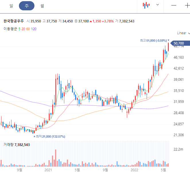 주봉상 많이 올라왔다. 2020년 대비 150% 올라왔다. 더 갈까?