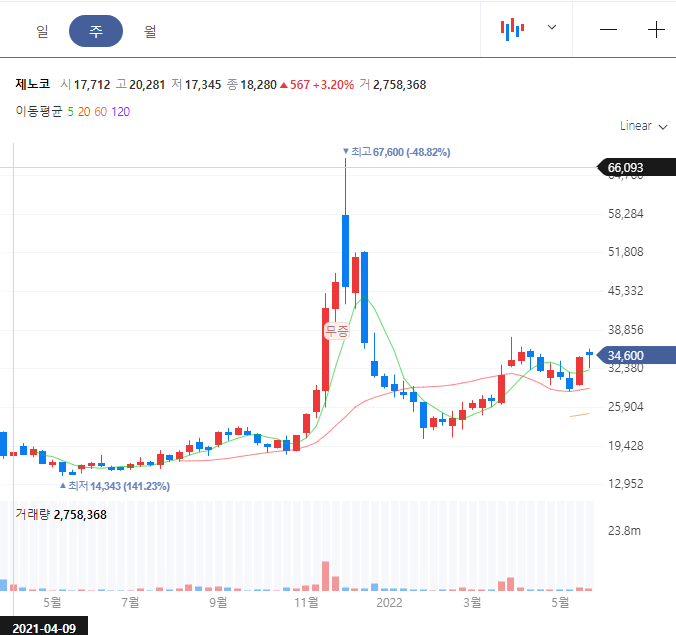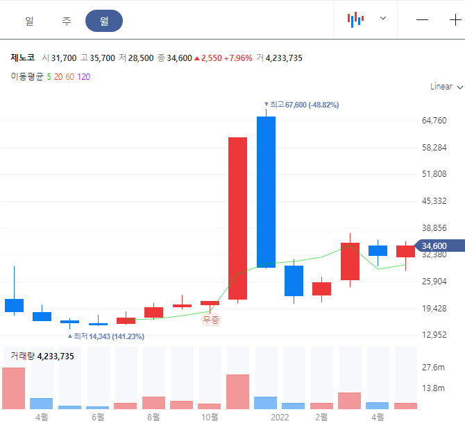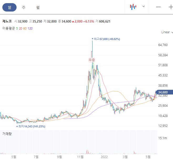 제노코의 일봉을 보면 작년 말 무상증자 이후 고점으로 회복하지 못하고 있으나, 120일 이평선을 깨지 않는 모양을 보여 주고 있다.