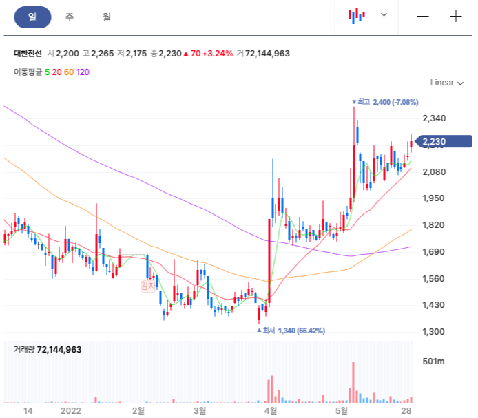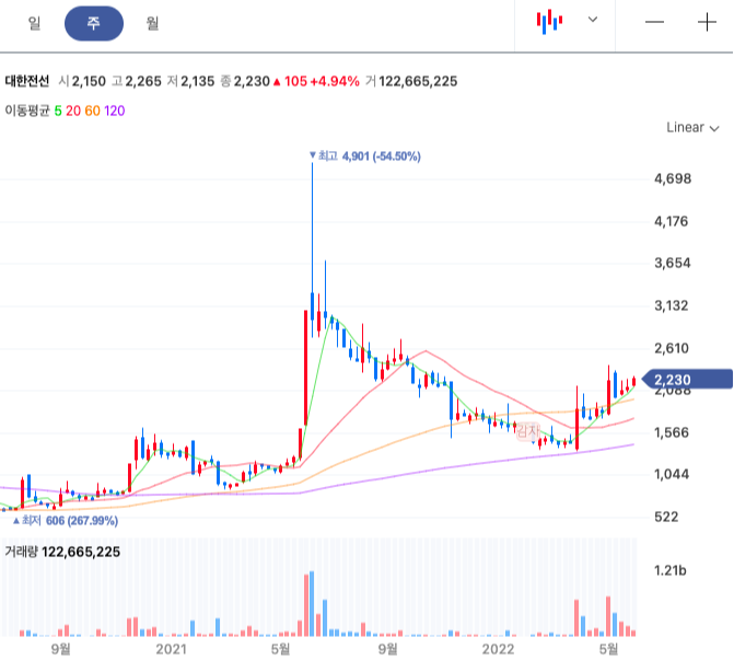 대한전선 주봉은 22년4월 바닥을 치고 올라오는 모습을 보여주고 있다.