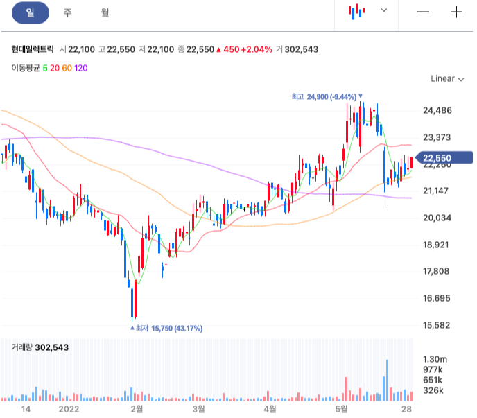 현대일렉트릭 일봉은 바닥 찍고 올라오는 주식의 모습이다.