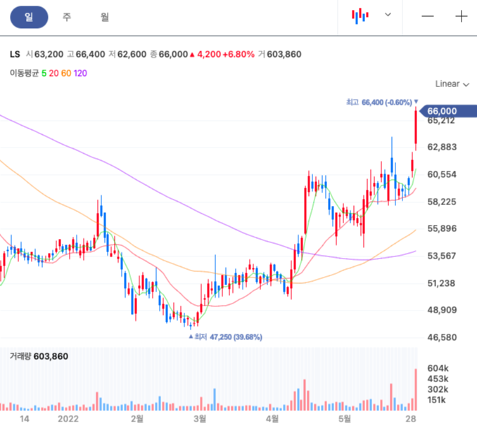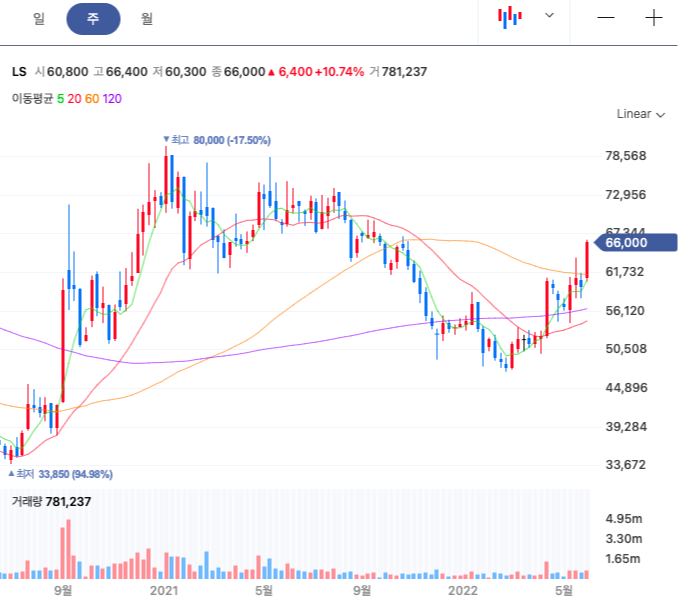 LS 주봉은 눌림목을 넘어 상승기를 보여준다. 전고점을 향해 가는 데, 잘 올라갈 지 자세히 볼 필요가 있다.