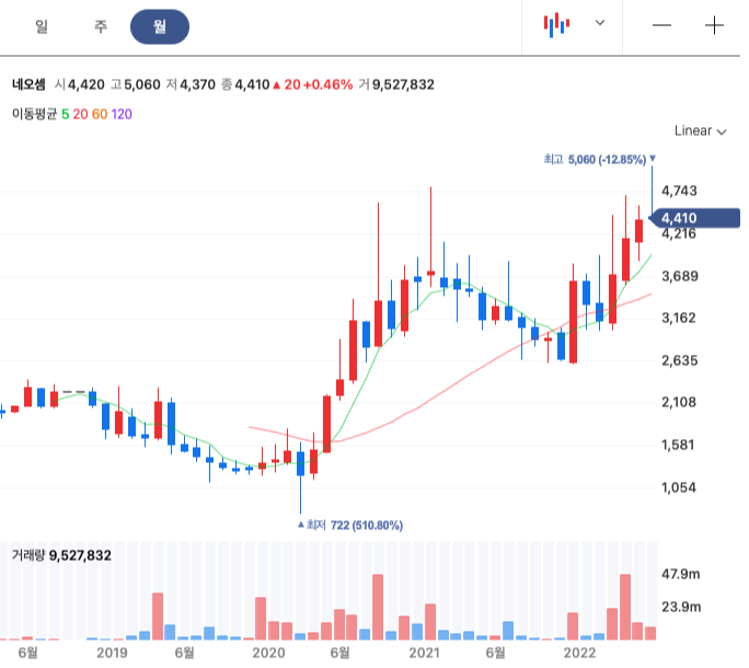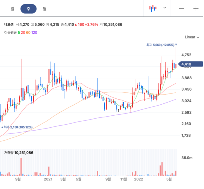 네오셈 실적에 대한 긍정적 보고가 나오면서 급등하는 모양이 6월 나온다.