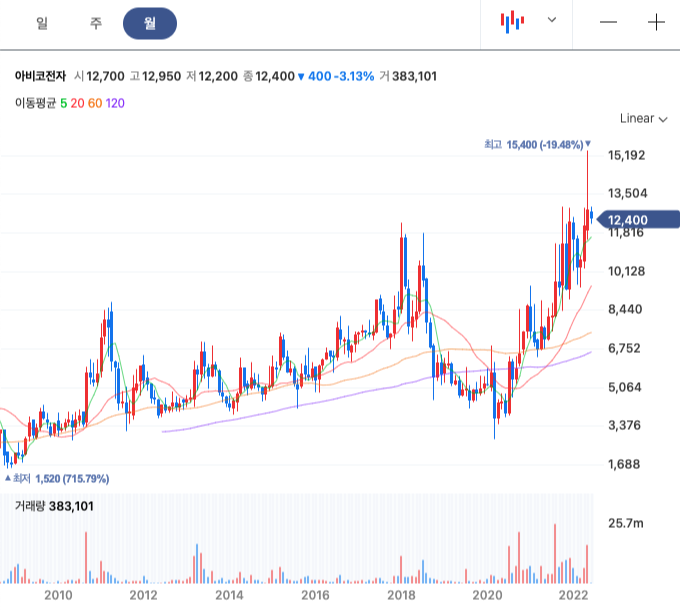 아비코전자 월봉을 보면 이 회사가 얼마나 꾸준히 성장해 왔는 지를 보여준다. 단기 급등락이 찾아왔었지만, 다시 과거 고점을 탈환하는 모양을 지속적으로 보여주고 있다. 이런 회사는 경영진의 노력이 대단한 회사라고 생각하면 된다.