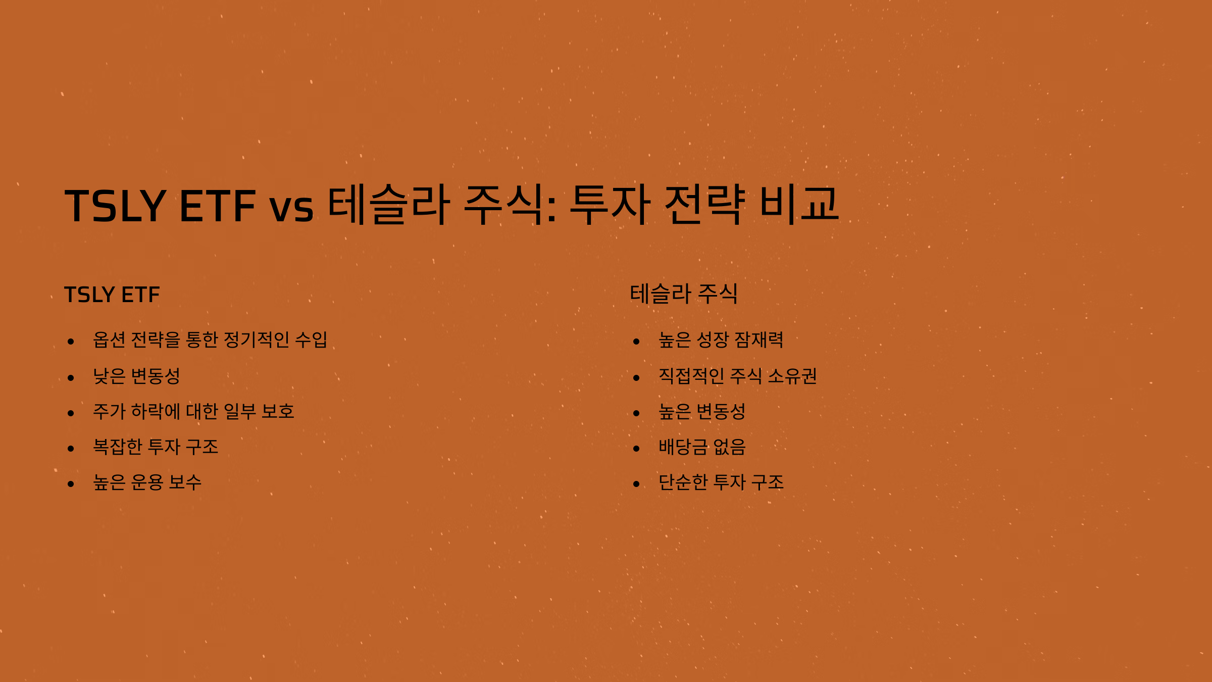 - TSLY는 높은 배당 수익률을 목표로 하지만, 원금 손실 가능성도 존재합니다.