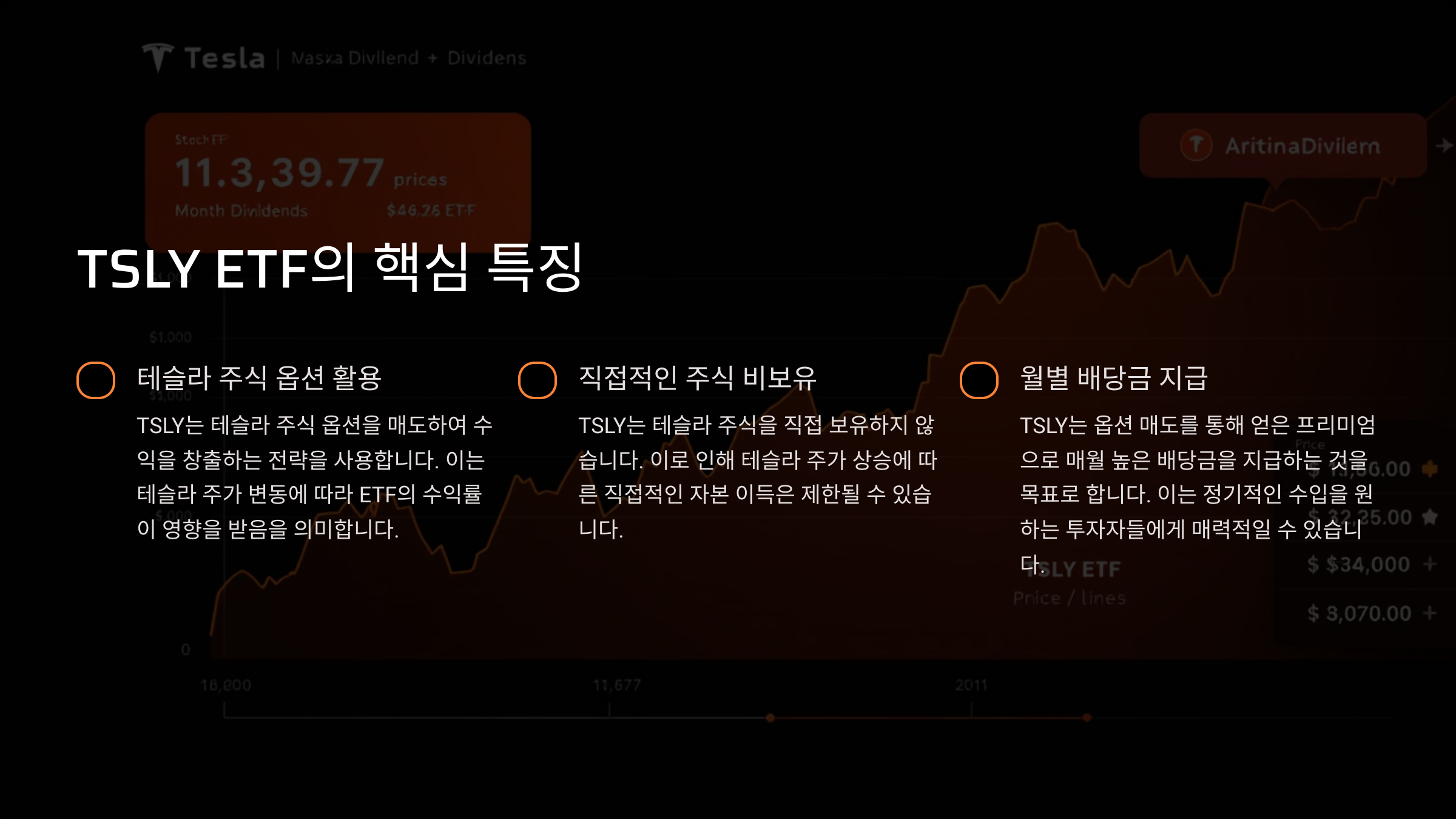 - 테슬라 주식 옵션을 활용: TSLY는 테슬라 주식을 직접 보유하는 대신, 테슬라 주식 옵션을 매도하여 수익을 창출하는 전략을 사용합니다. 즉, 테슬라 주가 변동에 따라 수익률이 영향을 받습니다.