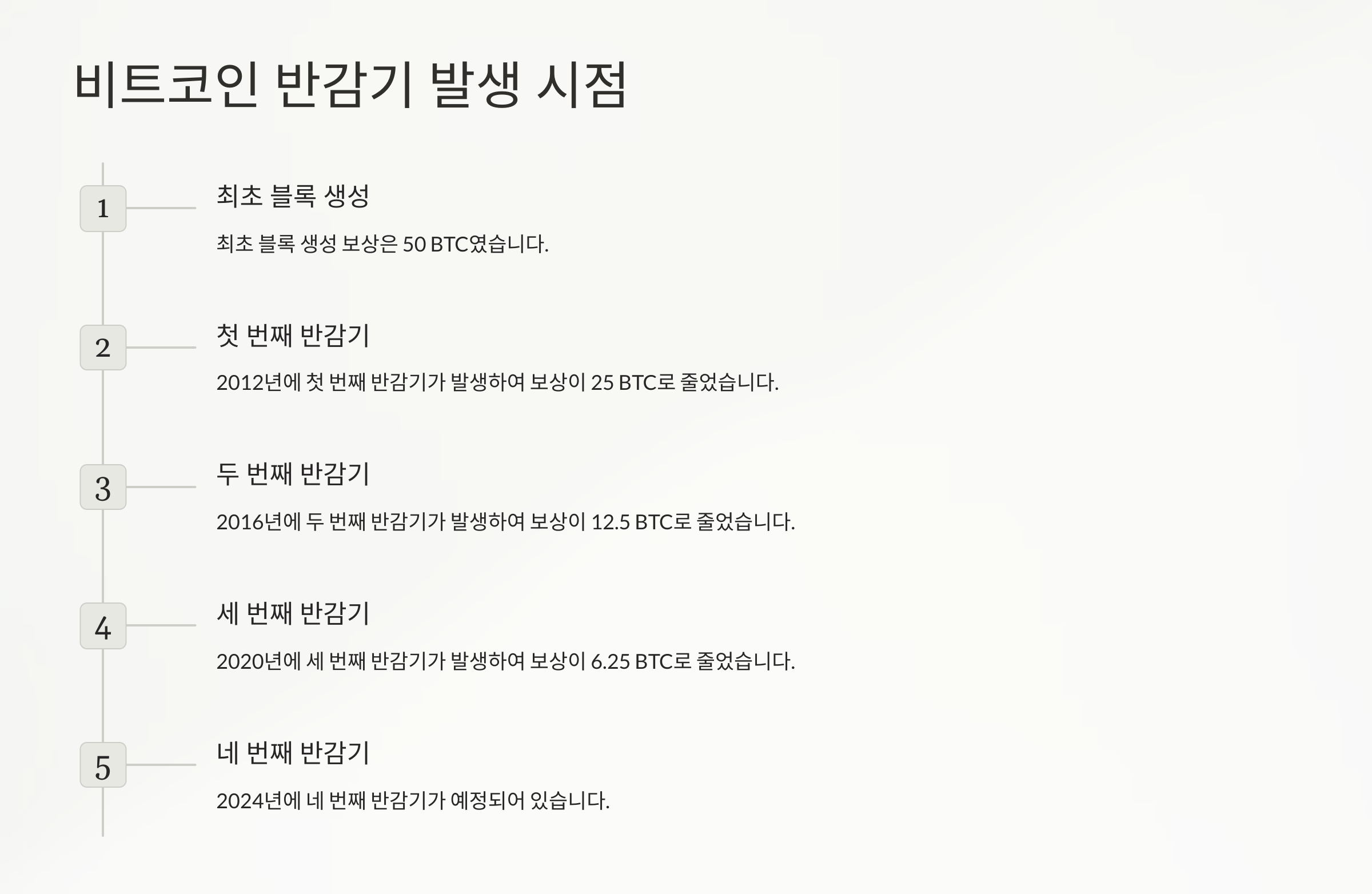 - 반감기 도입 이유: 비트코인은 총 발행량이 2,100만 개로 제한되어 있습니다. 무한정 비트코인이 생성된다면 가치가 떨어지겠죠? 따라서 비트코인은 약 4년마다 반감기를 통해 생성 속도를 조절하여 희소성을 유지합니다.