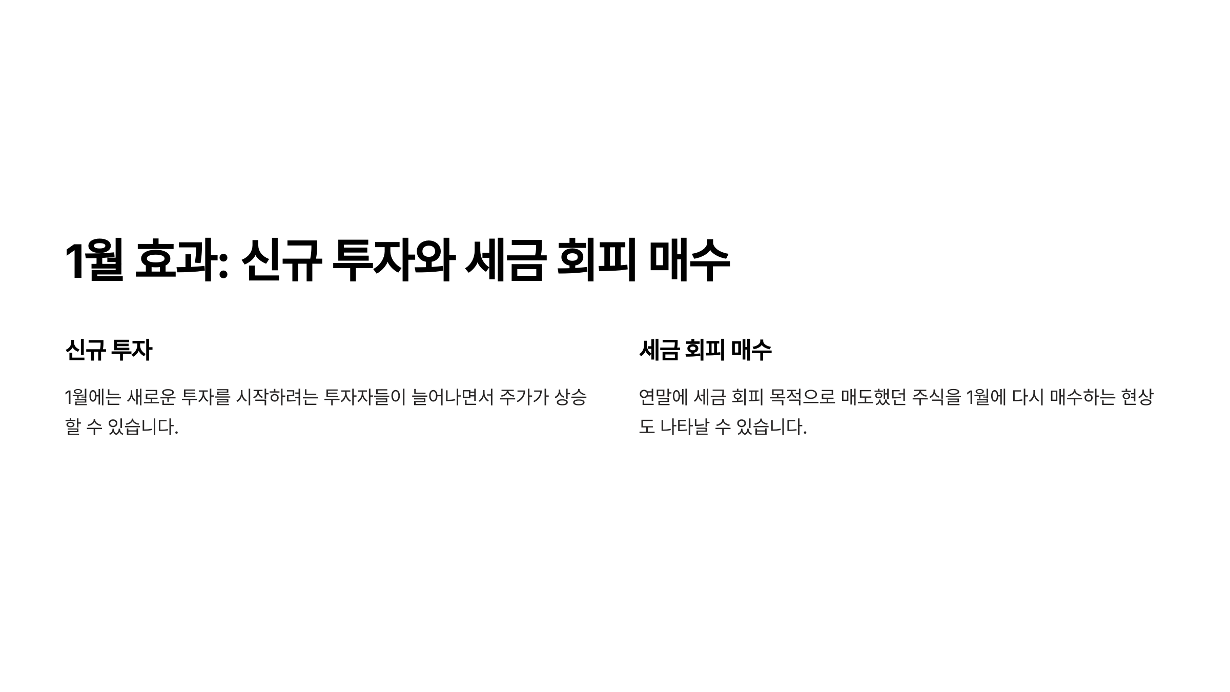 - 1월 효과: 1월에는 투자자들이 새로운 투자를 시작하거나, 연말에 세금 회피를 위해 팔았던 주식을 다시 매수하면서 주가가 상승하는 경향을 보이는 현상입니다.