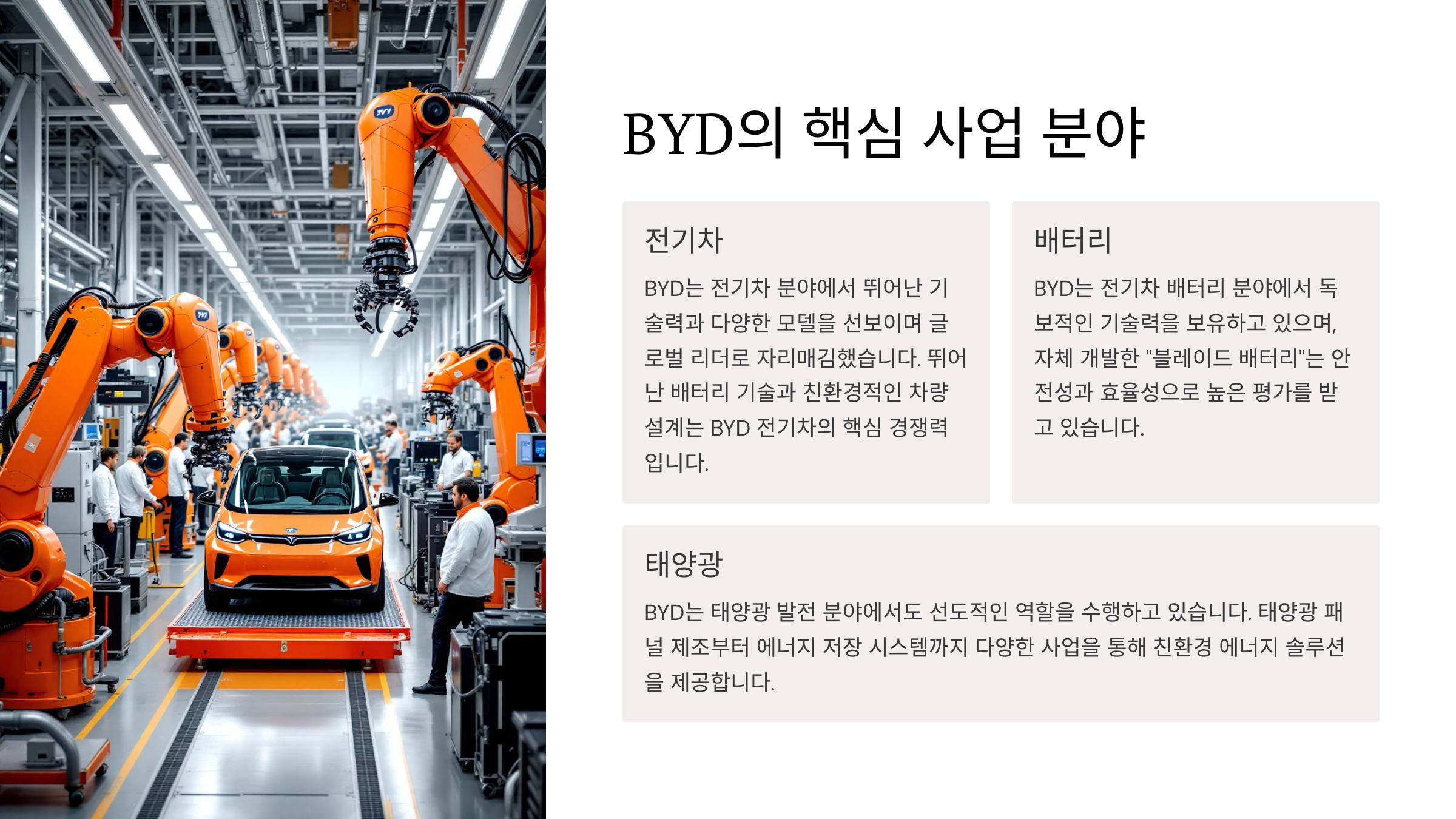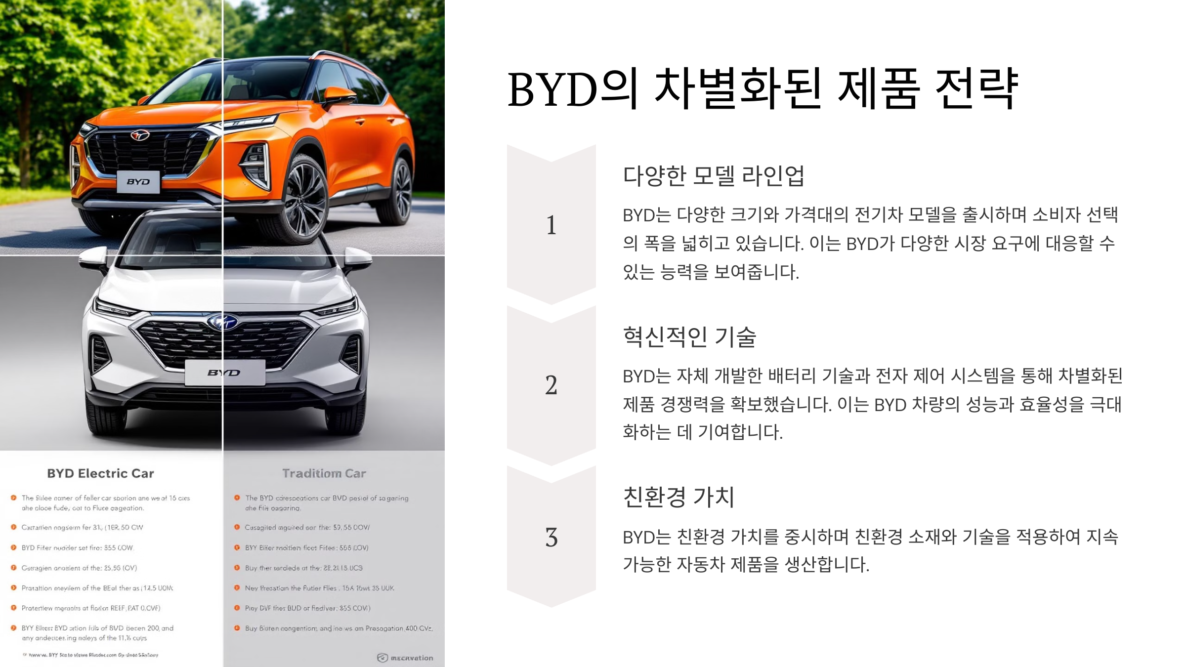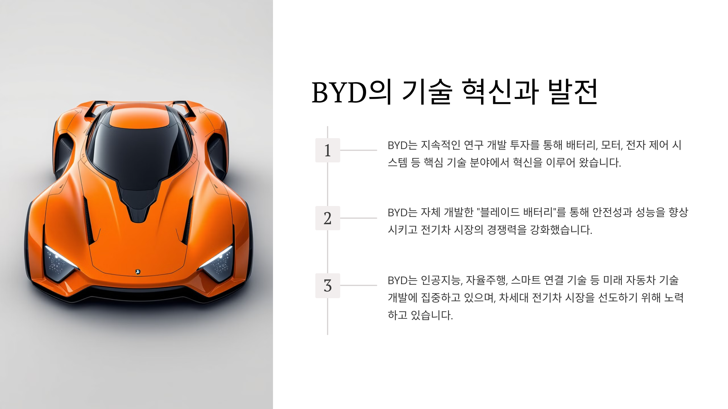 - 압도적인 기술력! 🔋 BYD는 배터리부터 모터까지 핵심 기술을 다 가지고 있어요. 기술력 = 경쟁력! 💪