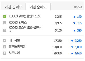 장 마감 후 기관 순매수/도 상황을 봤다. 기관의 순매수 종목 중 4위는 KODEX 레버리지, 5위는 KODEX코스닥 150 레버리지다. 장중에는 오히려 인버스 상품을 기관이 구매하는 듯했다. 장막판에 거의 몰빵으로 레버리지로 선회하여 기관이 구매했다. 반면 인버스는 어느 정도 비중을 줄였다. 코스피, 코스닥이 더 상승할 모멘텀이 있다고 판단한 것 같다.