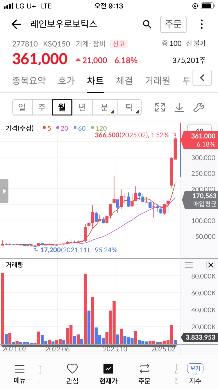 레인보우로보틱스 주가가 심싱치 않습니다. 일봉 주봉 월봉 모두 수직으로 오르고 있습니다. 하루 5%는 기본 20% 오를 때도 있죠.