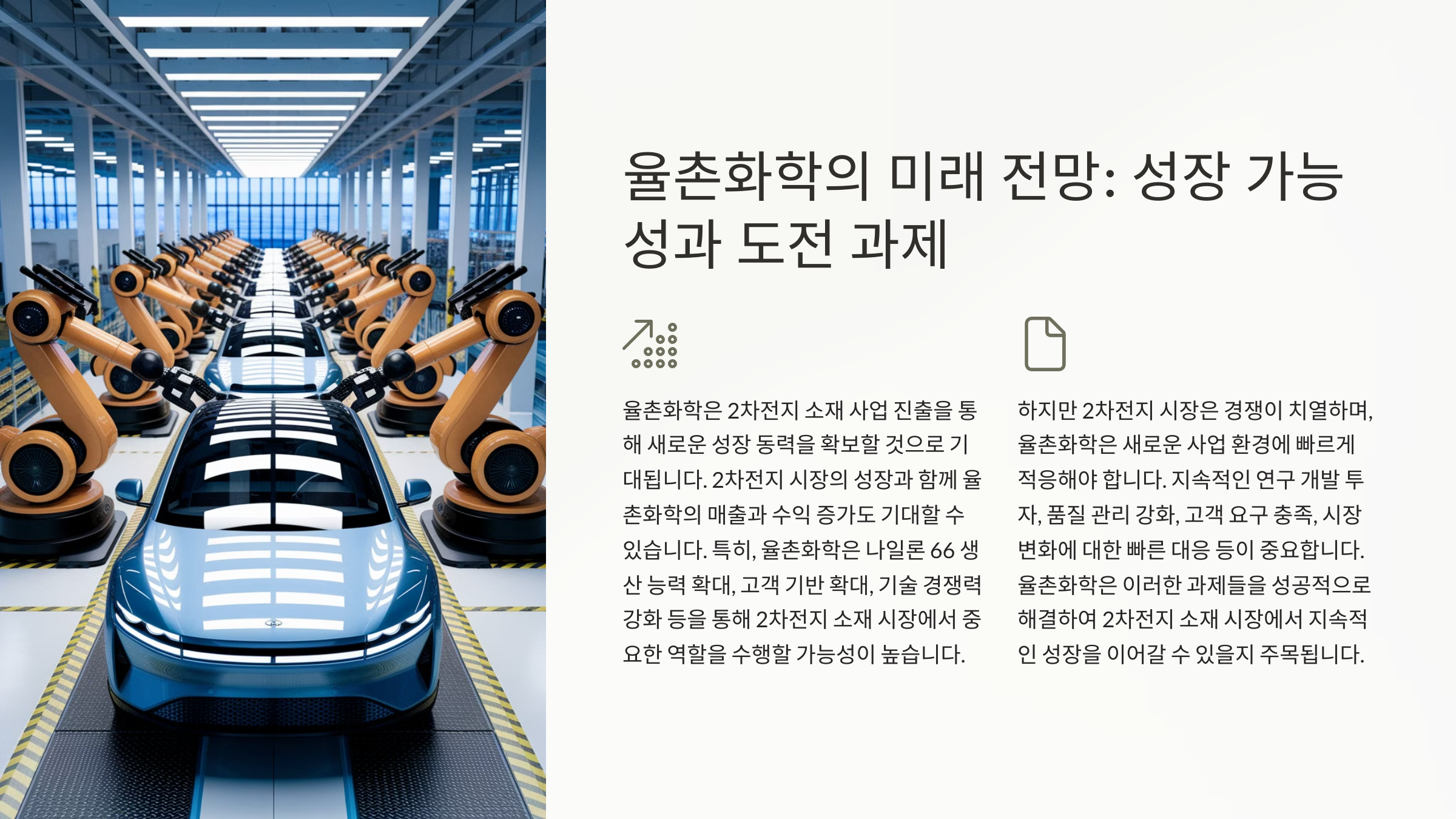 2차전지 시장은 전 세계적으로 빠르게 성장하고 있으며, 이에 따라 2차전지 소재에 대한 수요도 급증하고 있습니다. 율촌화학은 나일론 66 분야에서 오랜 기술력을 보유하고 있으며, 안정적인 생산 시스템을 구축하고 있습니다. 이러한 경쟁력을 바탕으로 율촌화학은 2차전지 소재 시장에서 значимую часть 차지할 것으로 예상됩니다.