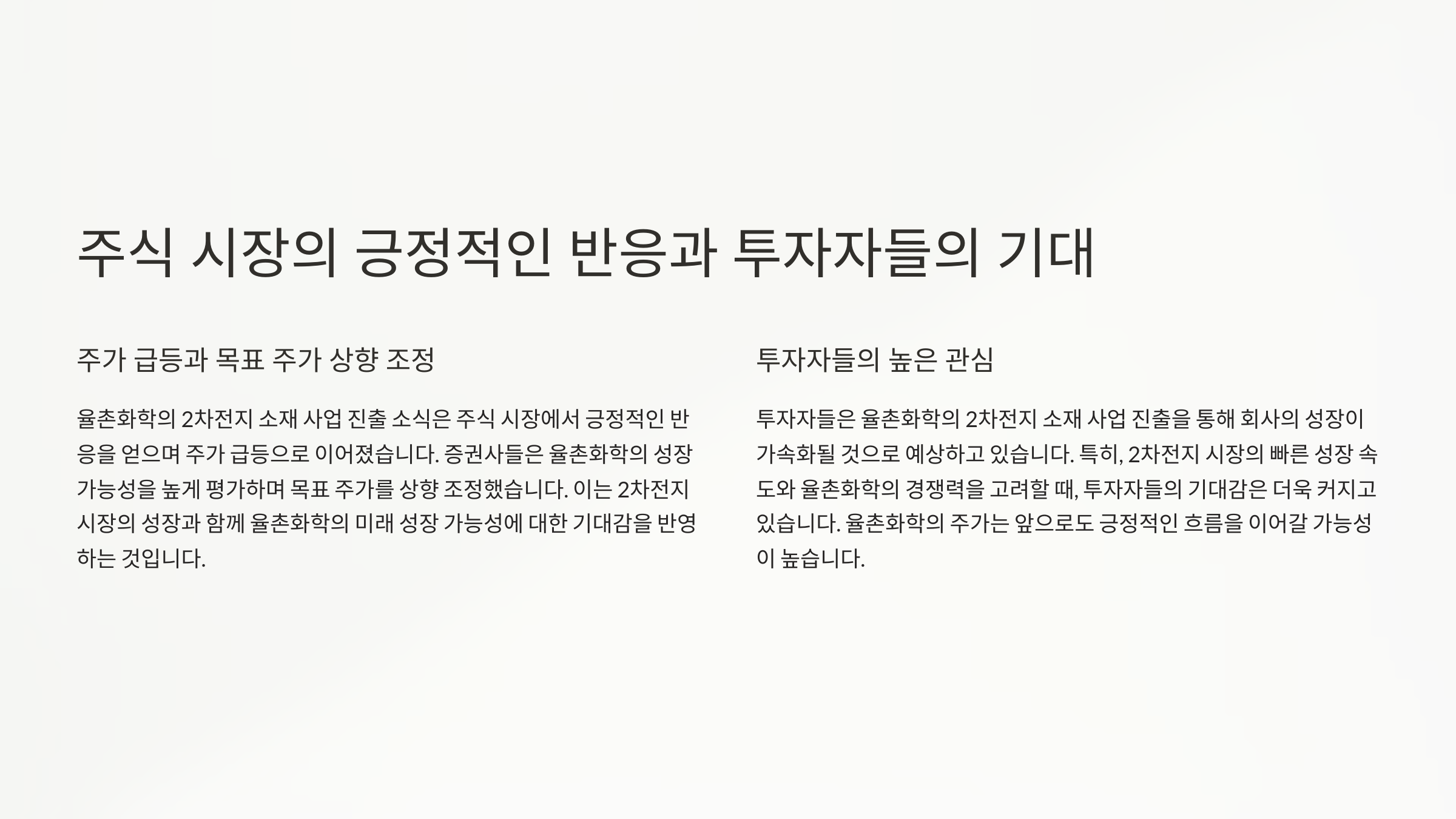 율촌화학의 2차전지 소재 사업 진출 소식은 주식 시장에서 긍정적으로 받아들여지고 있습니다. 율촌화학의 주가는 급등세를 보였으며, 증권사들은 율촌화학의 목표 주가를 상향 조정하기도 했습니다. 2차전지 시장 성장과 함께 율촌화학의 성장 가능성에 대한 기대감이 커지고 있는 상황입니다.