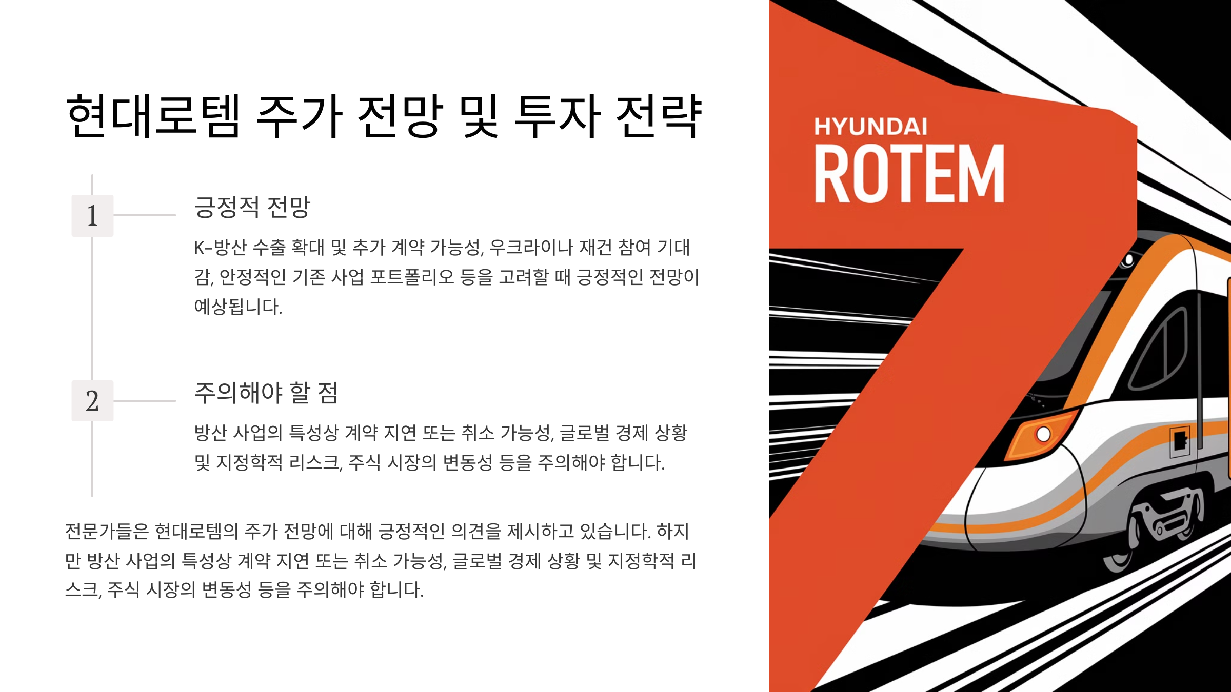 현대로템에 투자하기 전에 다음과 같은 사항들을 고려해야 합니다.