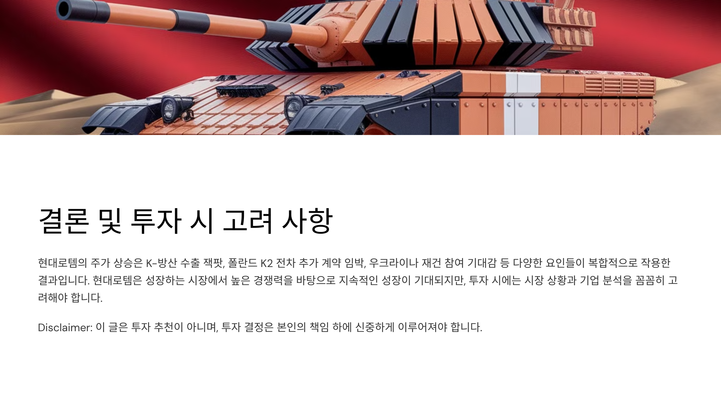 현대로템의 주가 상승은 K-방산 수출 잭팟, 폴란드 K2 전차 추가 계약 임박, 우크라이나 재건 참여 기대감 등 다양한 요인들이 복합적으로 작용한 결과입니다. 현대로템은 성장하는 시장에서 높은 경쟁력을 바탕으로 지속적인 성장이 기대되지만, 투자 시에는 시장 상황과 기업 분석을 꼼꼼히 고려해야 합니다.