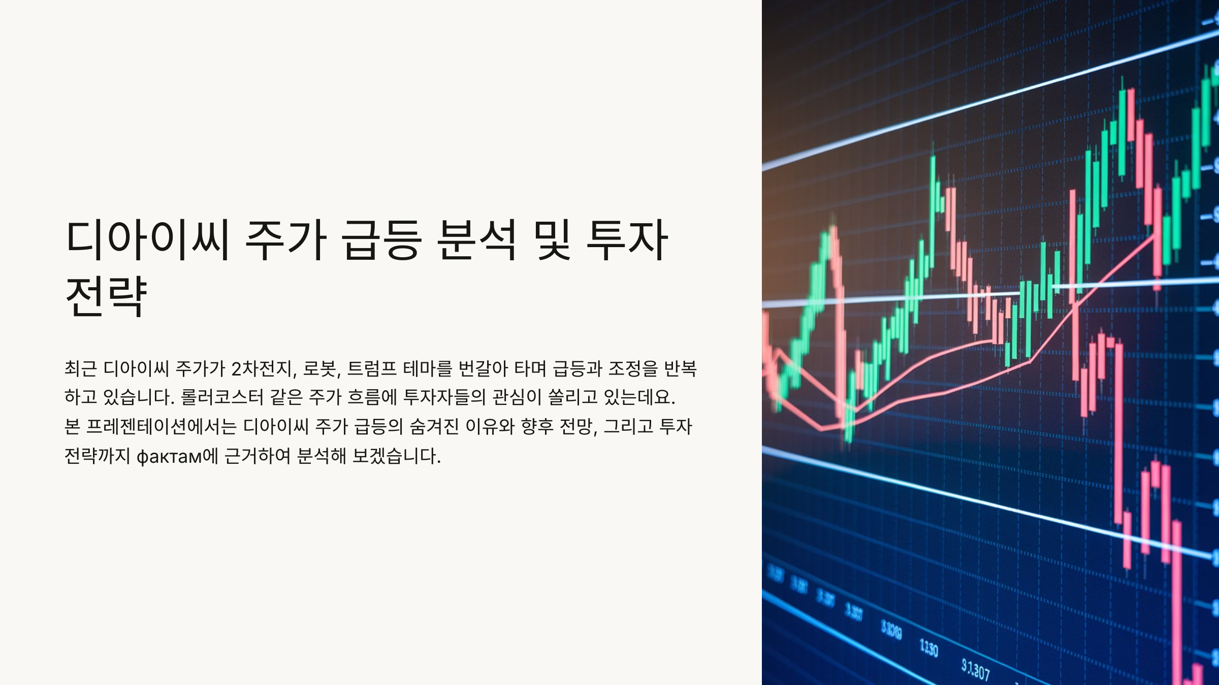 디아이씨의 주가 급등은 2차전지, 로봇, 트럼프 테마와 함께 시장 수급 요인이 복합적으로 작용한 결과입니다. 디아이씨는 성장하는 시장에서 사업 확장을 통해 높은 성장 가능성을 가지고 있지만, 투자 시에는 테마주로서의 변동성 등 리스크 요인을 신중하게 고려해야 합니다.