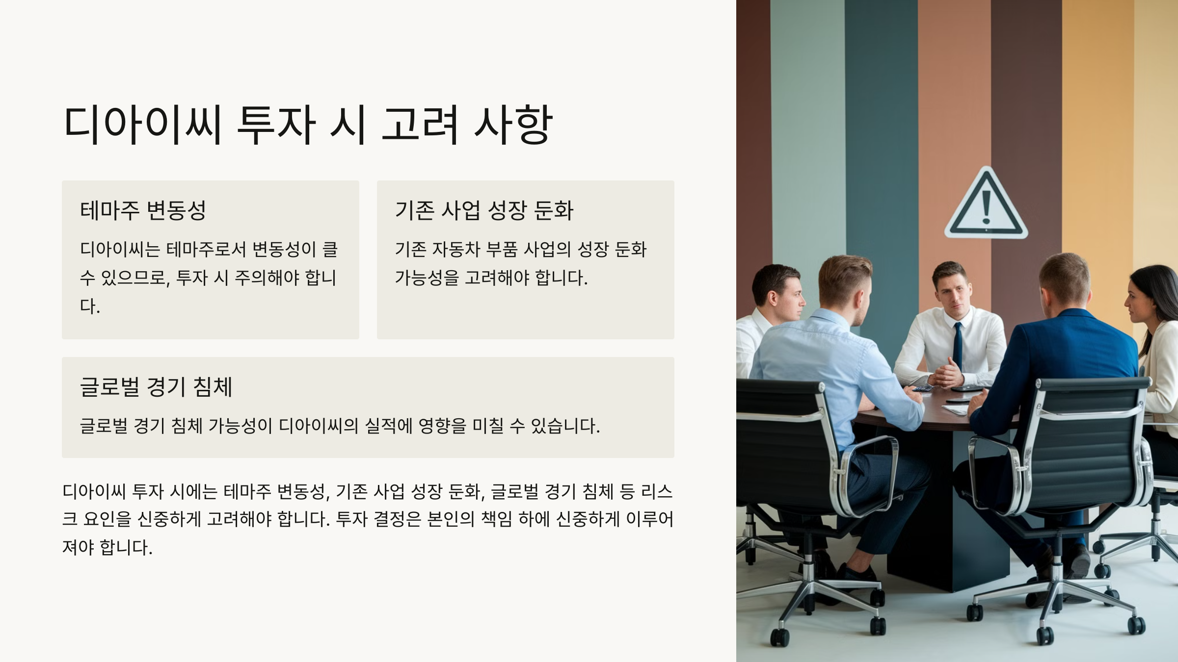 디아이씨에 투자하기 전에 다음과 같은 사항들을 고려해야 합니다.