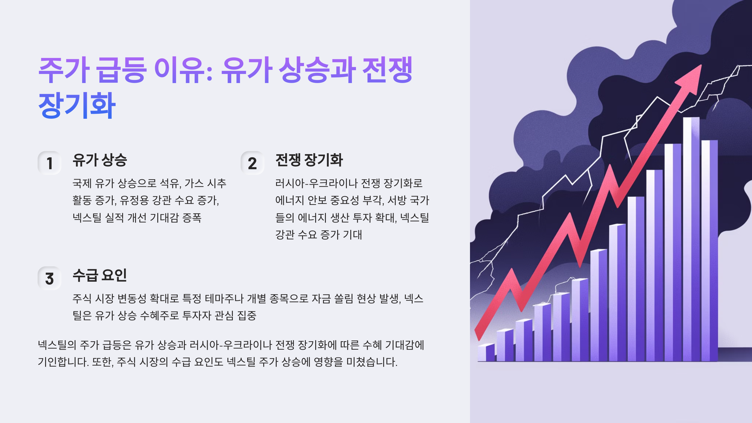 넥스틸의 주가 급등은 유가 상승과 러시아-우크라이나 전쟁 장기화에 따른 수혜 기대감이 반영된 결과입니다. 넥스틸은 에너지 시장 성장과 함께 높은 성장 가능성을 가지고 있지만, 투자 시에는 국제 유가 변동성 등 리스크 요인을 신중하게 고려해야 합니다.