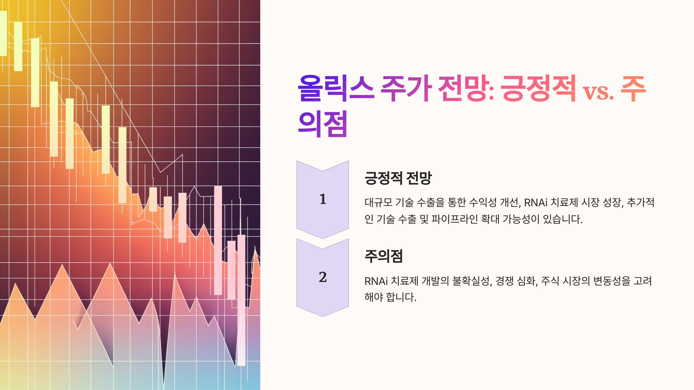 올릭스의 주가 급등은 9100억원대 기술 수출이라는 초대형 호재와 함께 RNAi 치료제 시장 성장 기대감이 반영된 결과입니다. 올릭스는 성장하는 시장에서 높은 경쟁력을 바탕으로 지속적인 성장이 기대되지만, 투자 시에는 시장 상황과 기업 분석을 꼼꼼히 고려해야 합니다.