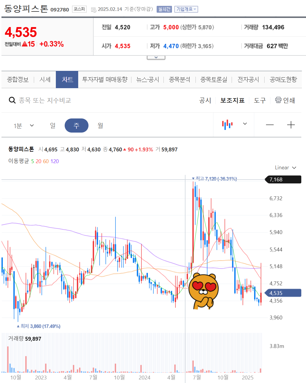 주가가 60주선마저 지지하지 못한다면 장기 하락 추세로 접어들 확률이 매우 높습니다. 이 경우 주가가 50% 이상 하락할 수도 있으므로, 60주선 지지 여부를 주의 깊게 살펴야 합니다.