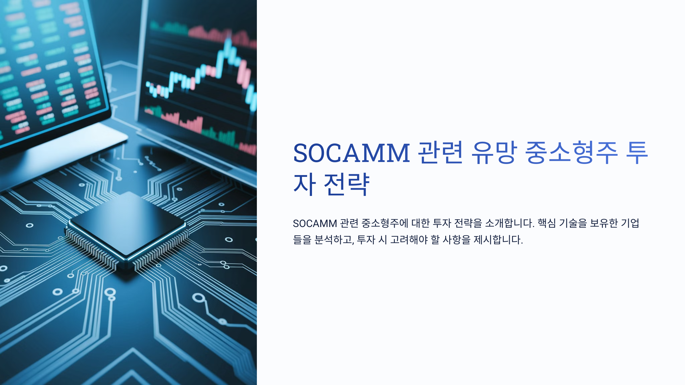 이 외에도 SOCAMM 관련 기술을 보유하고 있거나, SOCAMM 생태계 확장에 따라 수혜를 입을 가능성이 있는 중소형주들이 존재합니다. 하지만 투자에는 신중한 접근이 필요하며, SOCAMM 기술의 발전, 시장 동향, 관련 기업들의 경쟁력 등을 종합적으로 고려하여 투자 결정을 내리는 것이 바람직합니다.