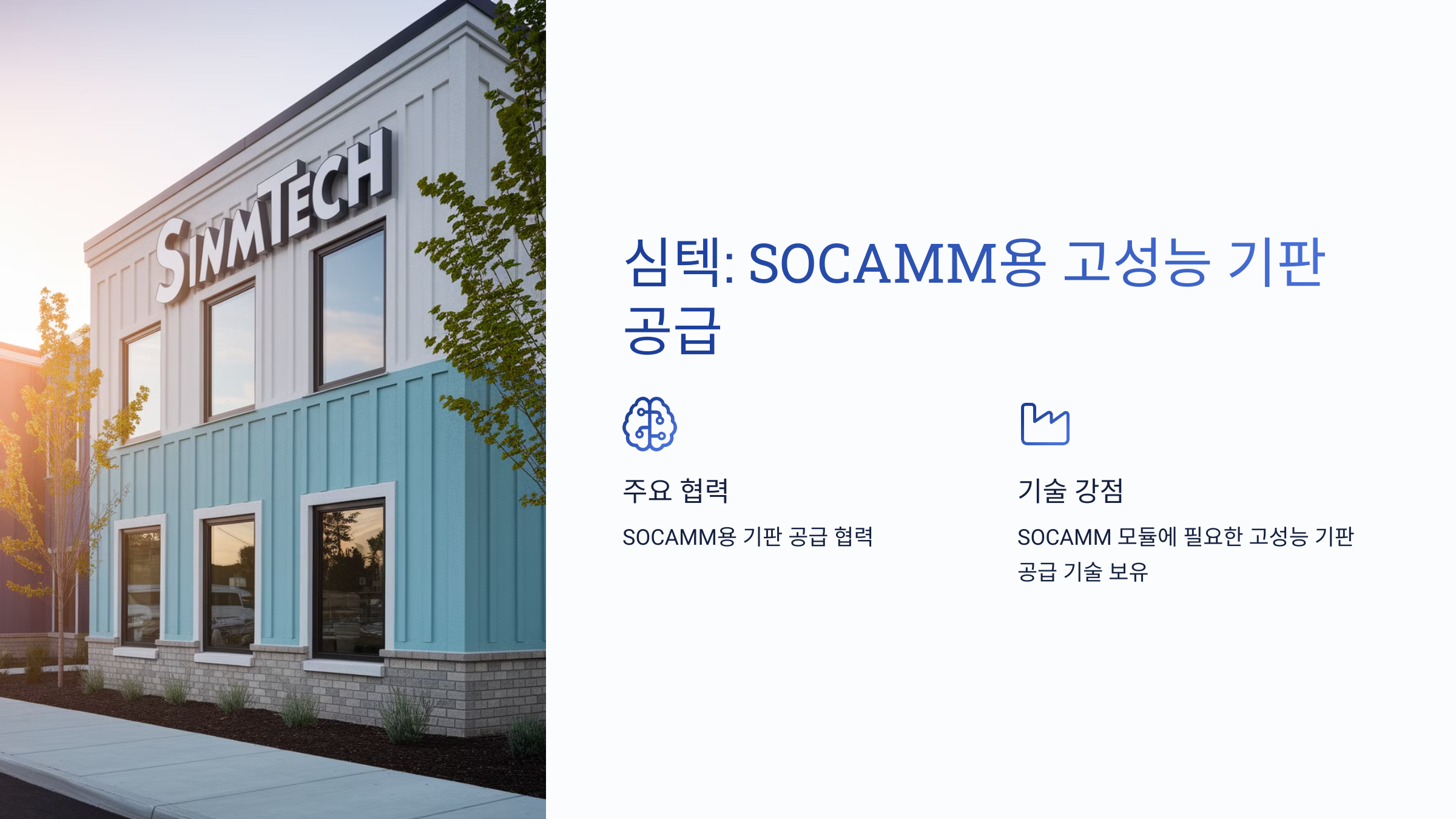 - 심텍: SOCAMM용 기판 공급을 위해 협력하는 기판 업체로, SOCAMM 모듈에 필요한 고성능 기판을 공급할 수 있는 기술력을 갖추고 있습니다 .