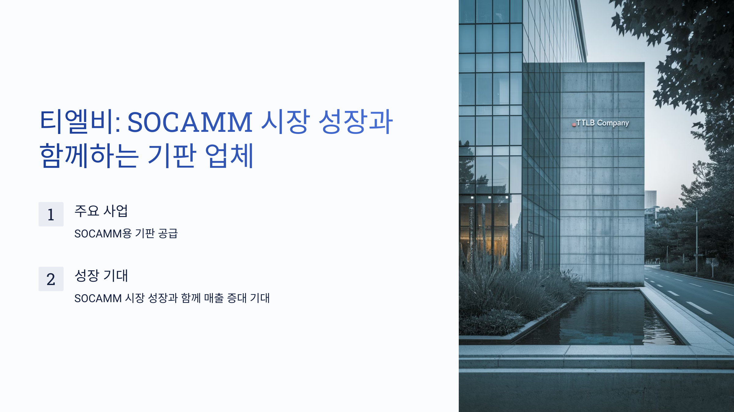 - 티엘비: 심텍과 마찬가지로 SOCAMM용 기판 공급을 위해 협력하는 기판 업체로, SOCAMM 시장 성장과 함께 매출 증대가 기대됩니다 .