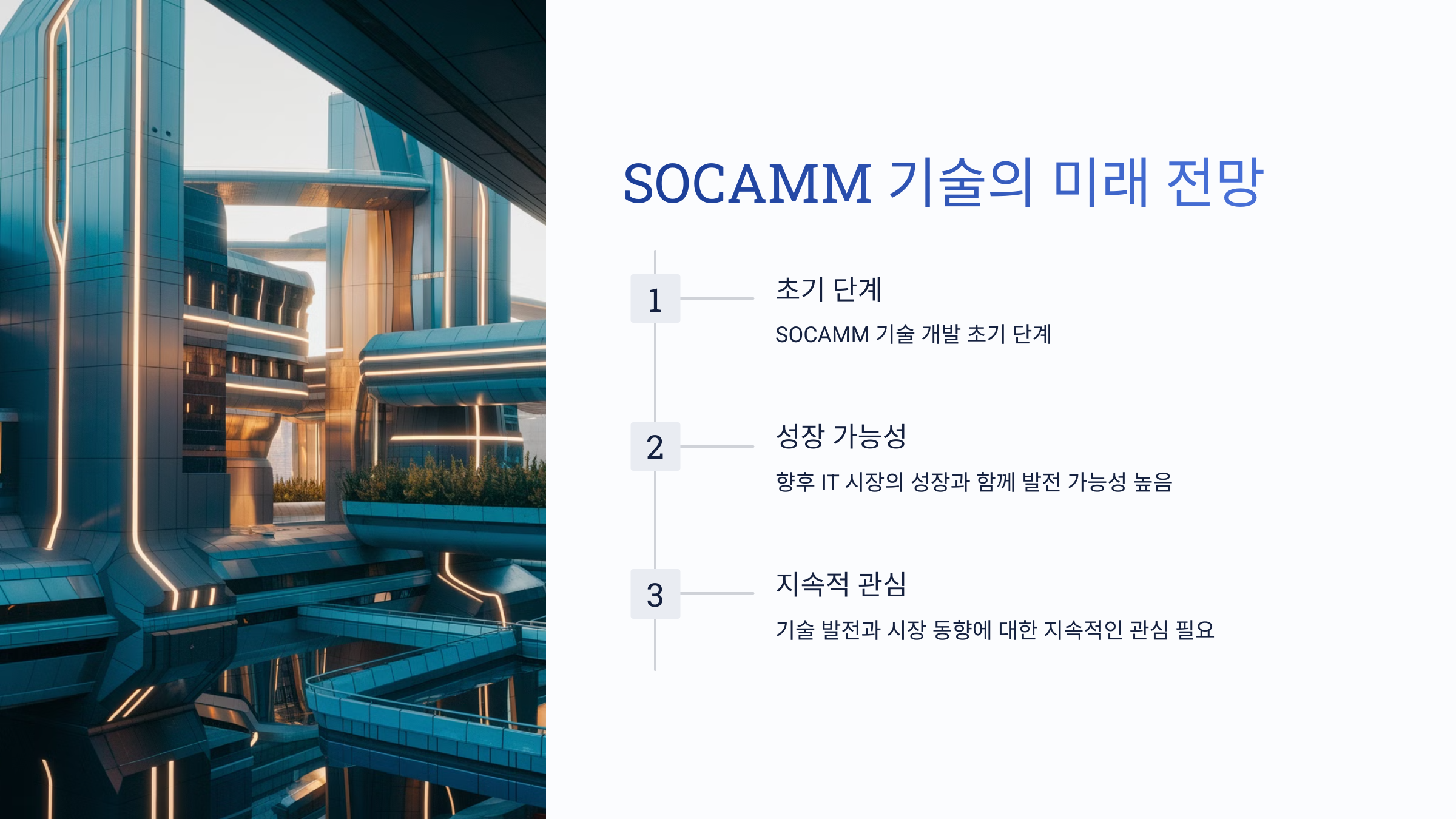 - 장기적인 관점에서 투자: SOCAMM 기술은 장기적인 성장 가능성이 높으므로 장기적인 관점에서 투자하는 것이 바람직합니다. SOCAMM 시장은 아직 초기 단계이므로 단기적인 수익보다는 장기적인 성장 가능성에 주목해야 합니다.