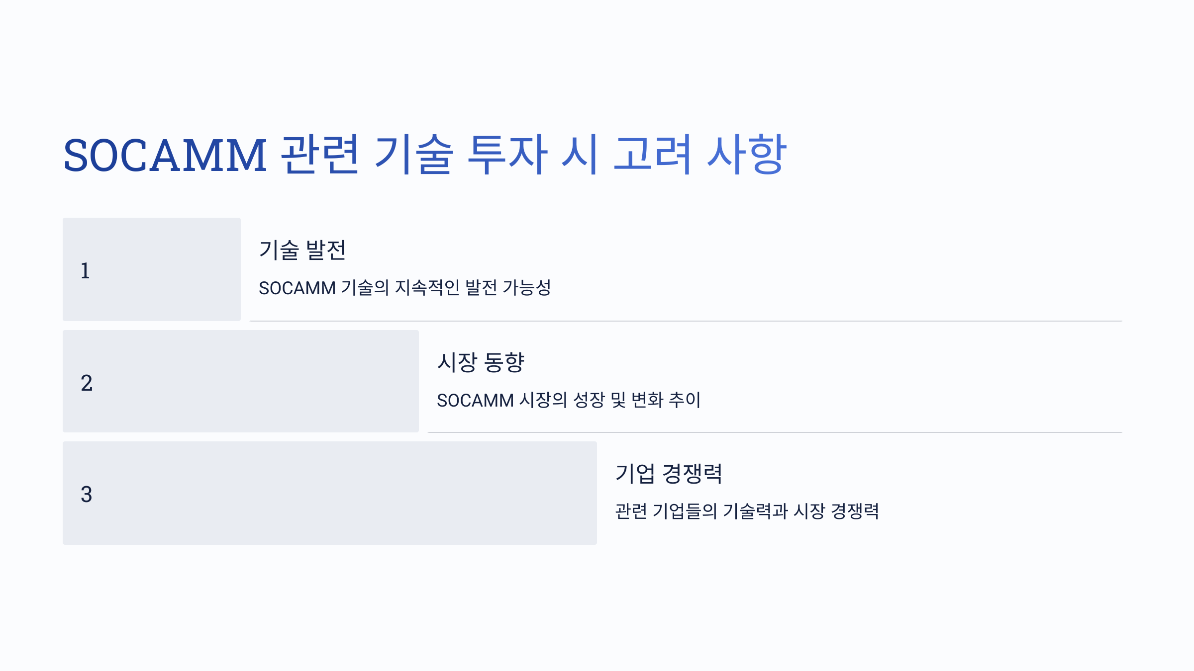 - 기술 동향 및 시장 변화 주시: SOCAMM 기술 동향, 시장 변화, 경쟁 상황 등을 지속적으로 주시하고 투자 전략을 수정해야 합니다. SOCAMM 기술은 빠르게 발전하고 있으며, 시장 상황도 끊임없이 변화하고 있습니다. 따라서 투자자들은 SOCAMM 관련 정보를 지속적으로 업데이트하고 투자 전략을 유연하게 조정해야 합니다.