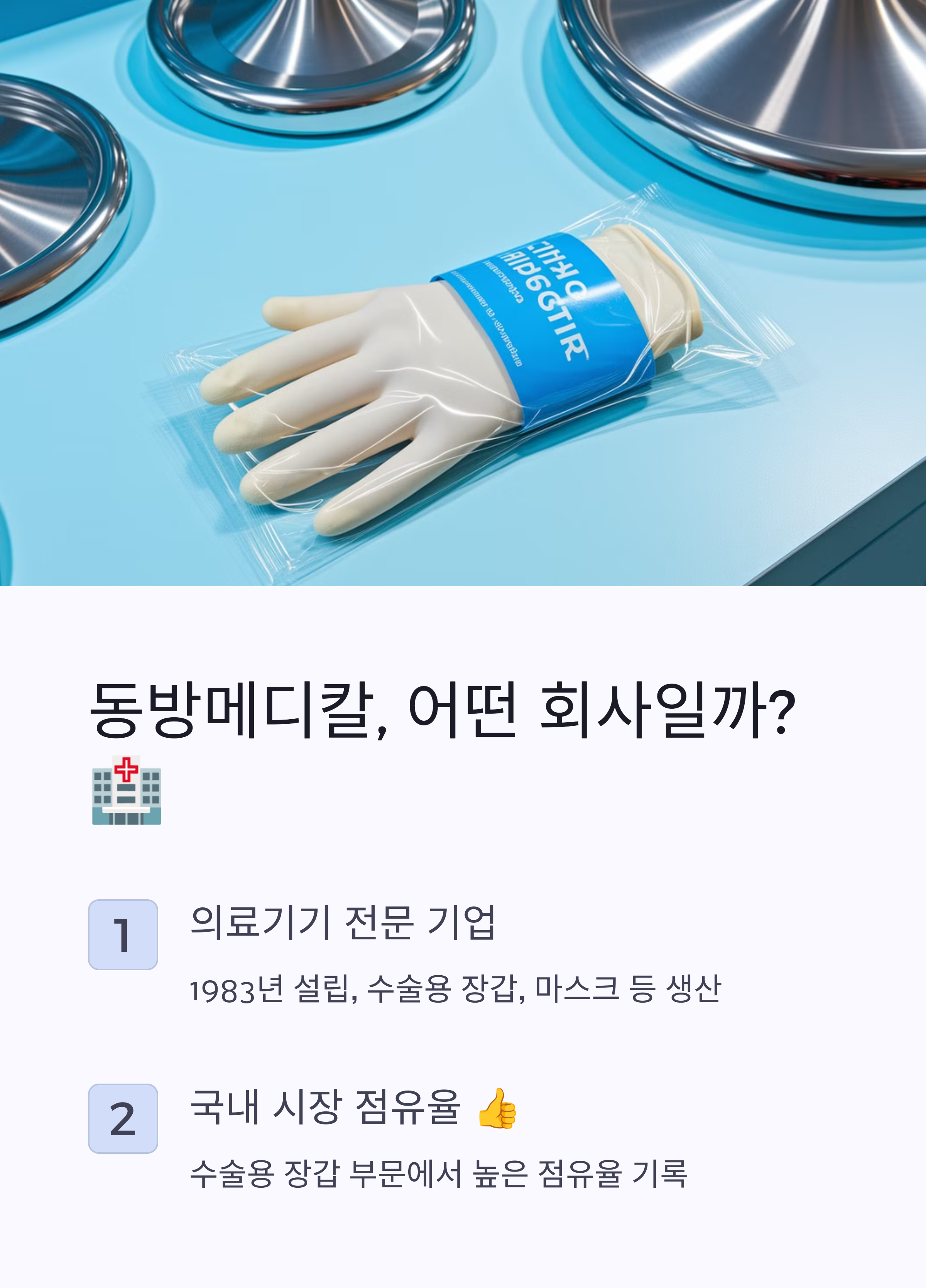 동방메디칼은 1983년 설립된 의료기기 전문 기업입니다. 주요 제품으로는 수술용 장갑, 의료용 마스크, 드레싱재, 멸균 제품 등이 있으며, 국내 시장에서 높은 점유율을 차지하고 있습니다.