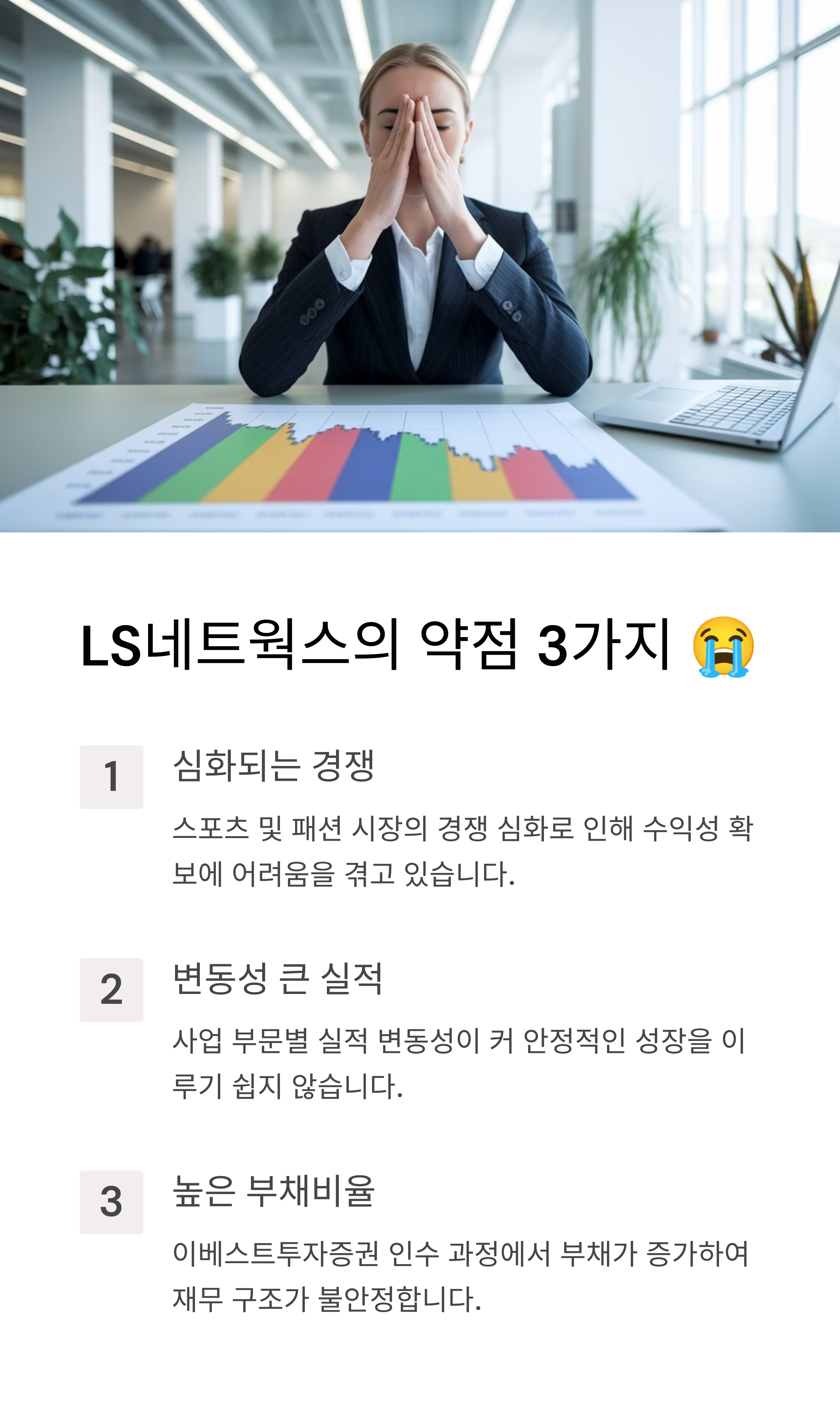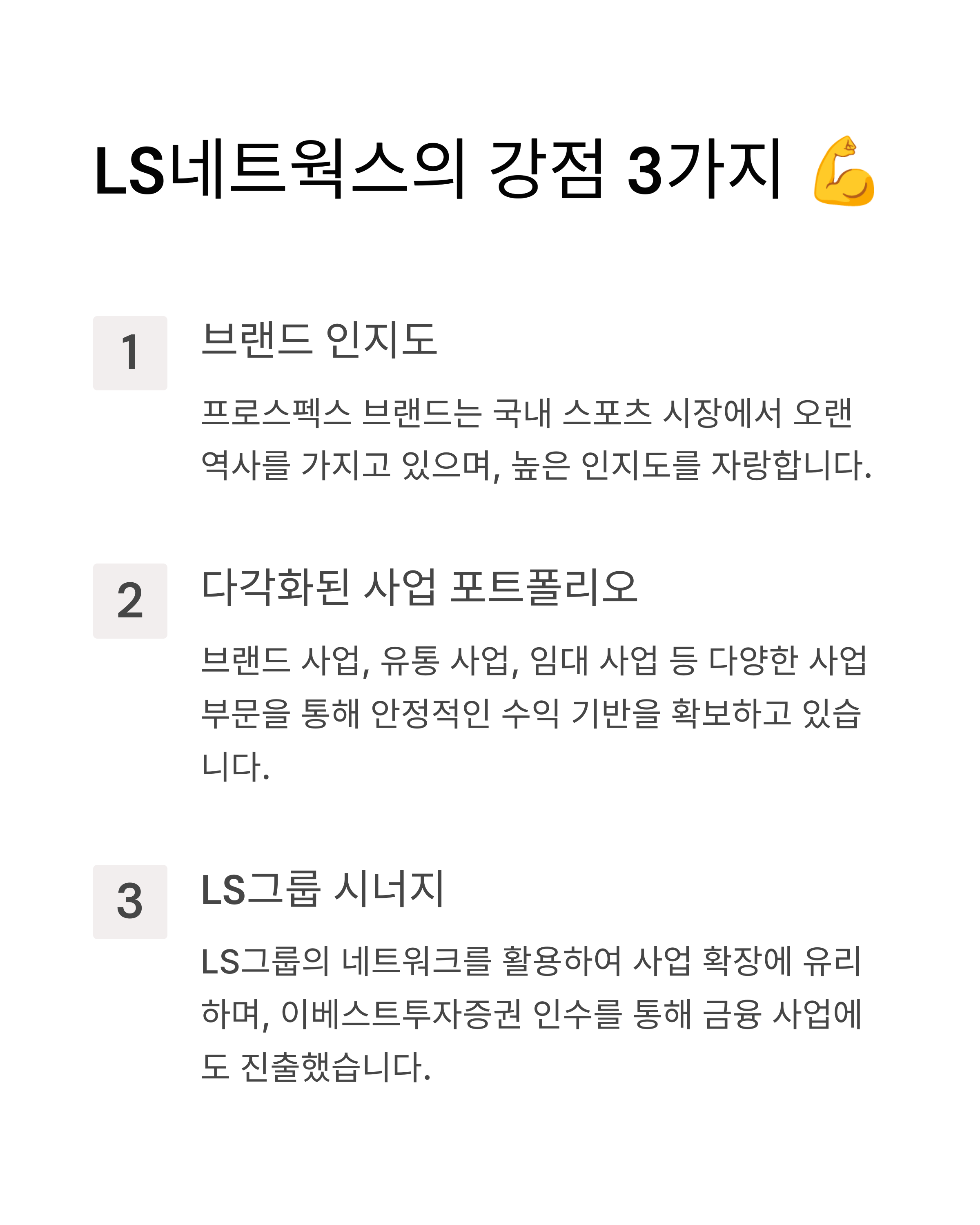 LS네트웍스는 LS그룹의 소비재 부문 핵심 기업으로, 스포츠 의류 및 용품 브랜드 사업, 유통 사업, 그리고 임대 사업을 영위하고 있습니다. 주요 브랜드로는 프로스펙스가 있으며, 이베스트투자증권의 대주주이기도 합니다.