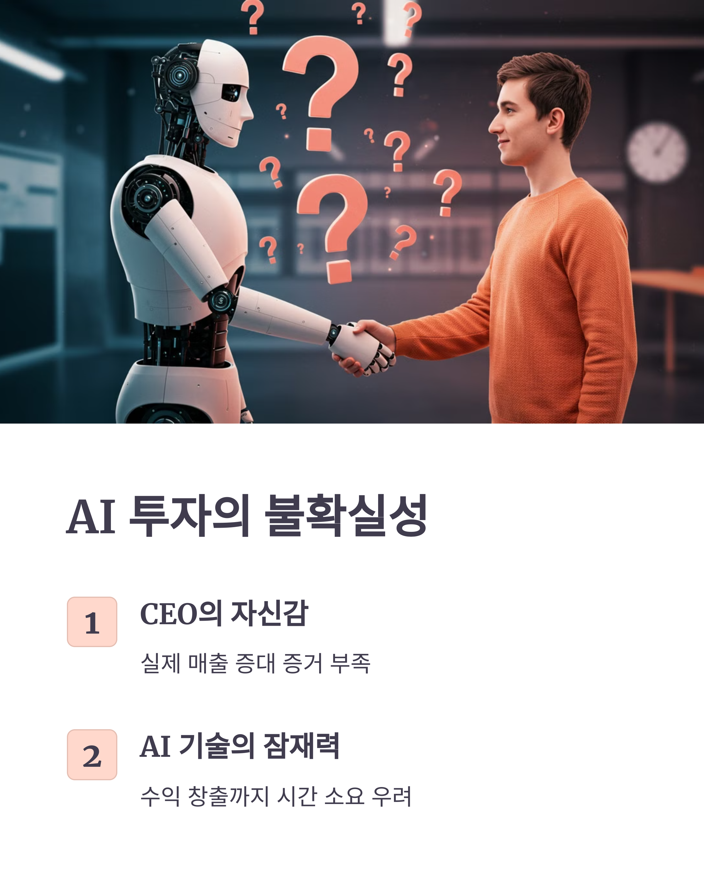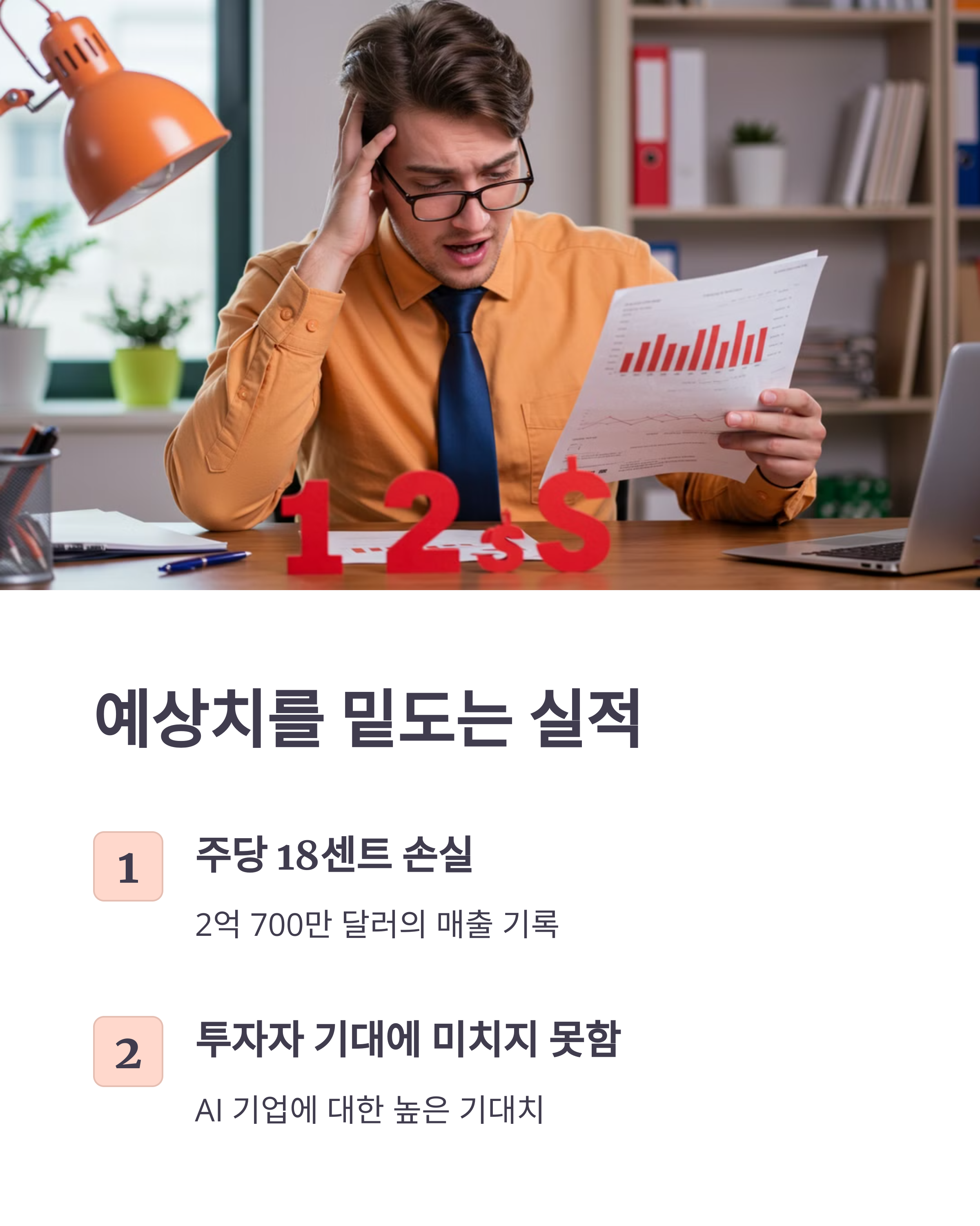 - AI 투자에 대한 불확실성: CEO는 AI 투자에 대한 자신감을 표명했지만, 아직까지 AI 기술이 실제 매출 증대로 이어지는 확실한 증거를 보여주지 못하고 있다는 점이 투자자들의 불안감을 자극했을 수 있습니다. AI 기술의 잠재력은 높지만, 실질적인 수익 창출까지는 시간이 걸릴 수 있다는 점을 투자자들이 우려하는 것으로 해석될 수 있습니다.